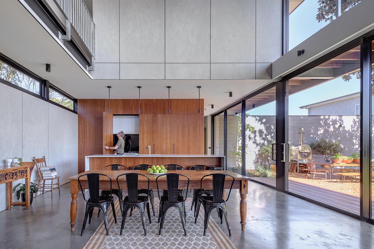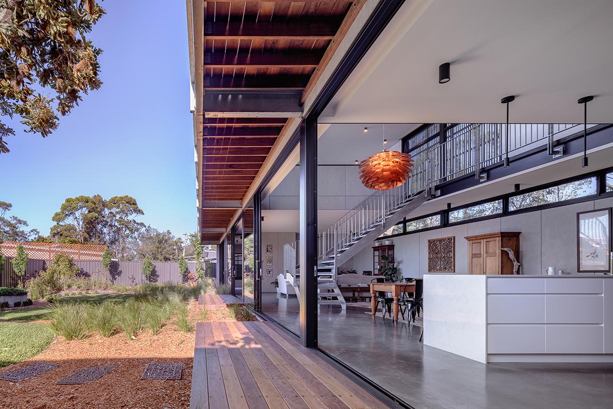 Reflecting the strong character of the exterior steel and concrete walls, the interior steel elements feature hot dip galvanized finish. A simple but robust mix of materials can also be found inside the home which includes concrete floors, cement sheet walls and timber lining to joinery. External sliding timber screens are also used over windows to allow for privacy when required.