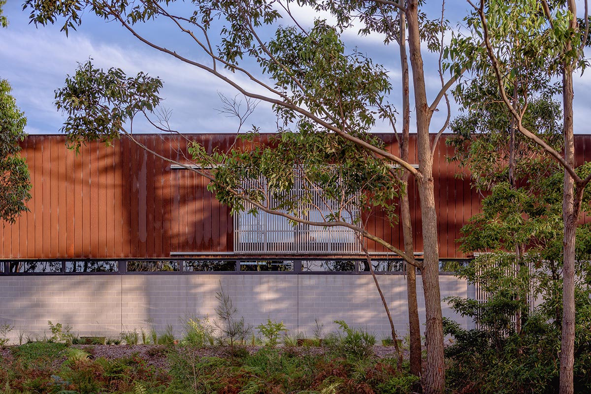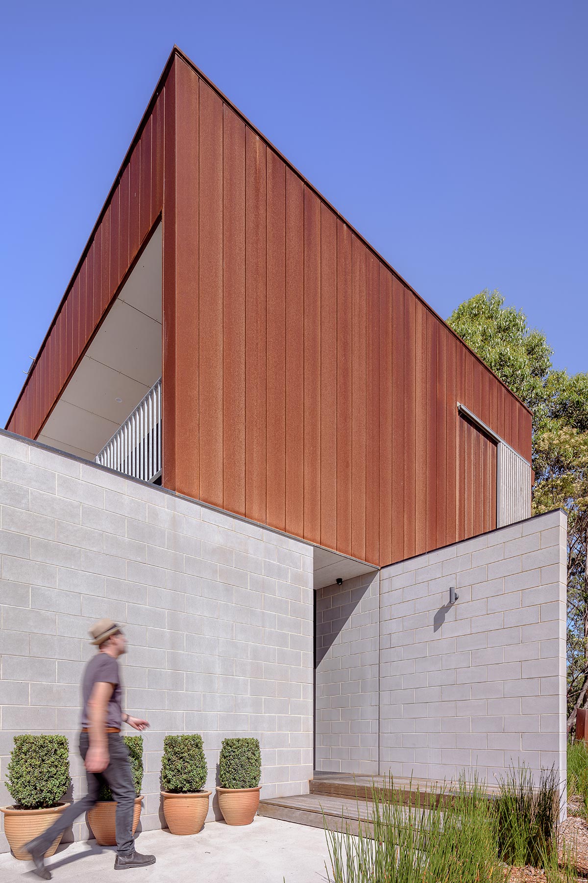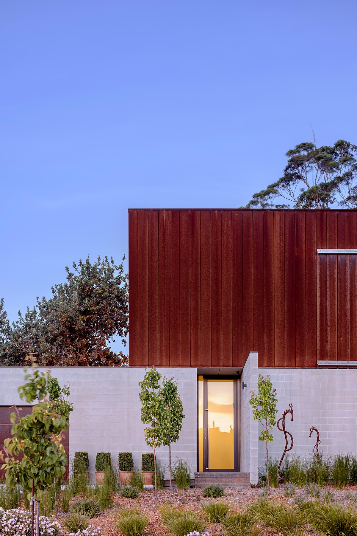 “The home is constructed of weathering steel exterior cladding at the upper floor and concrete block at the lower level. The concrete block provides shelter from the adjacent public reserve to the south, but opens to the north with stacking glass doors allowing opening of the main living spaces to the outdoors. The weathering steel provides a rich rusted red colour that anchors the building comfortably within the local native landscape.” – Ben Walker Architects
