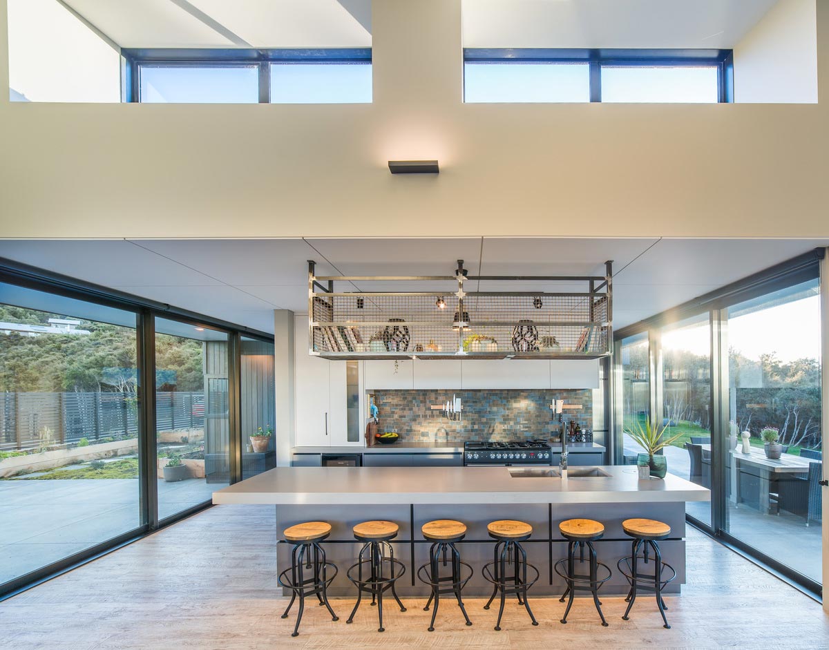 Named for its bush setting, the Kanuka Rise features different takes on the views which can be seen from every room, with stacked sliders around the periphery to allow for unimpeded vistas and easy connections with outdoor spaces. Since daylight is limited in this part of the world, the house is angled to the west to absorb as much sunlight as possible, with chunky eaves shading direct heat in the summer.