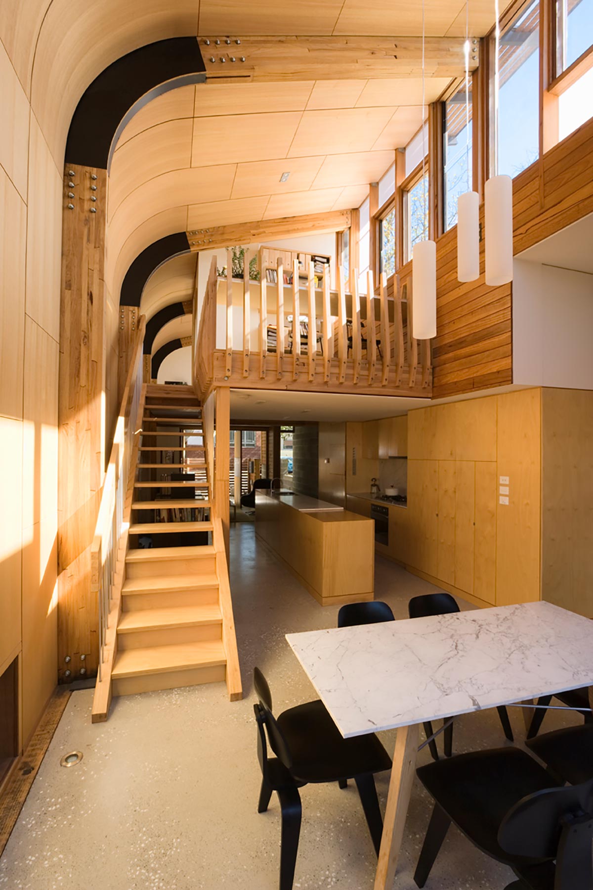“As a consequence passive solar and thermal design principles inform the building’s spatial and formal resolution. The link – a linear element matching the neighbouring wall and containing circulation and services – was created on the northern boundary, exaggerating the cliff-like quality of the northern edge. Platforms were established; some anchored on the ground, others floating up against the link. Finally, two sun shells were introduced, enclosing the platforms. Peeping over the link, the sun shells capture sunlight, reflecting it inside -and establishing the necessary temperature differential for cross ventilation.” – Tandem Design Studio