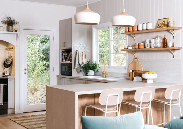 Lovely Erin (my own personal Bunnings assistant) had all of the Kaboodle swatches for me see. I selected Molasses V for the doors and panels and Black Pudding for the benchtops. These two worked really well together as the subtle texture and graphite nature of Black Pudding complemented the flat, matte black finish of the Molasses V. I was slightly concerned that it was very ‘dark’ so we also ordered a piece of Vic Ash from the Kaboodle range so that we could add in some open shelving solutions. The timber being a natural material really helped to bring warmth to the design and the open shelving allowed me to bring some personality to the space by styling plants, cookbooks and vases.