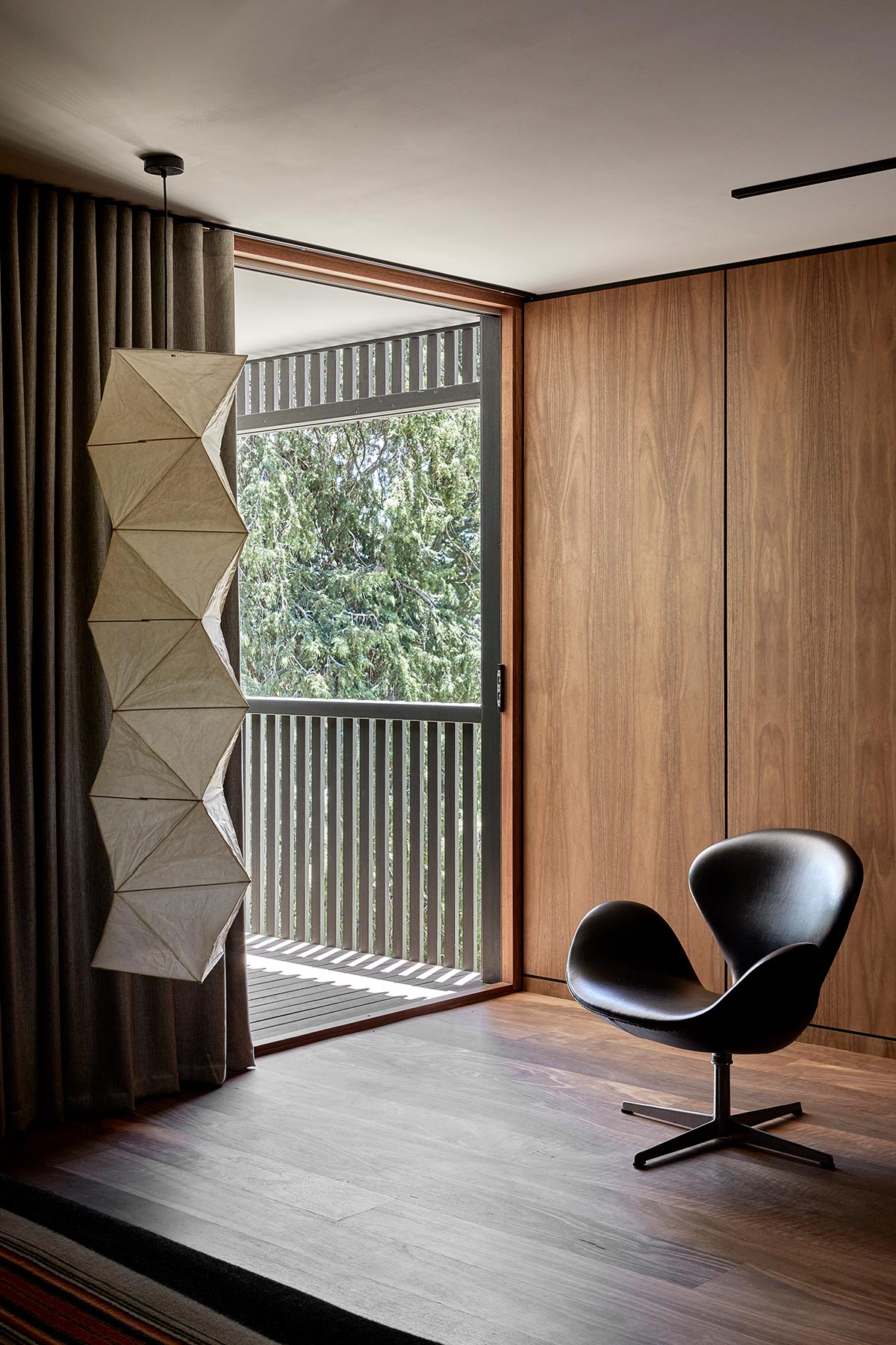 The addition comprises the main bedroom suite with a deck attached for entertaining, as well as a carport and workshop underneath. A great deal of care was taken to preserve the structural and material quality of the original 70s home, which was sought to complement rather than duplicate.
