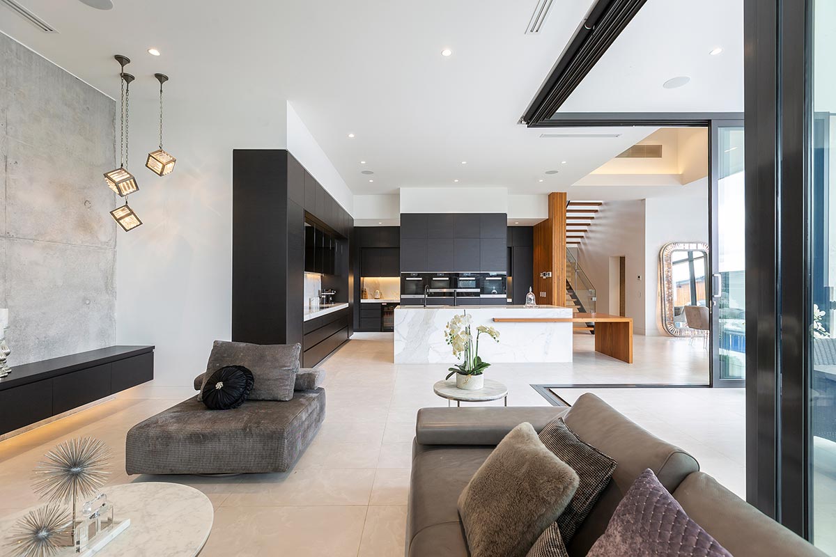 “There is a master bedroom and open ensuite are separated from the other three bedrooms located at the upper level. The upper level gallery connects the upper level bedrooms, bathroom and toilet areas. Picture windows within the bedrooms are used to frame and capture the long-range views without the distraction of other houses nearby. At the lower level the main living and dining areas are hinged by the kitchen that connects seamlessly to both the living and dining space. A small gym and theatre room is snuggled in close proximity to the open living spaces yet functionally separated so that each room can be used without impeding the function of the other.” – Oztal Architects