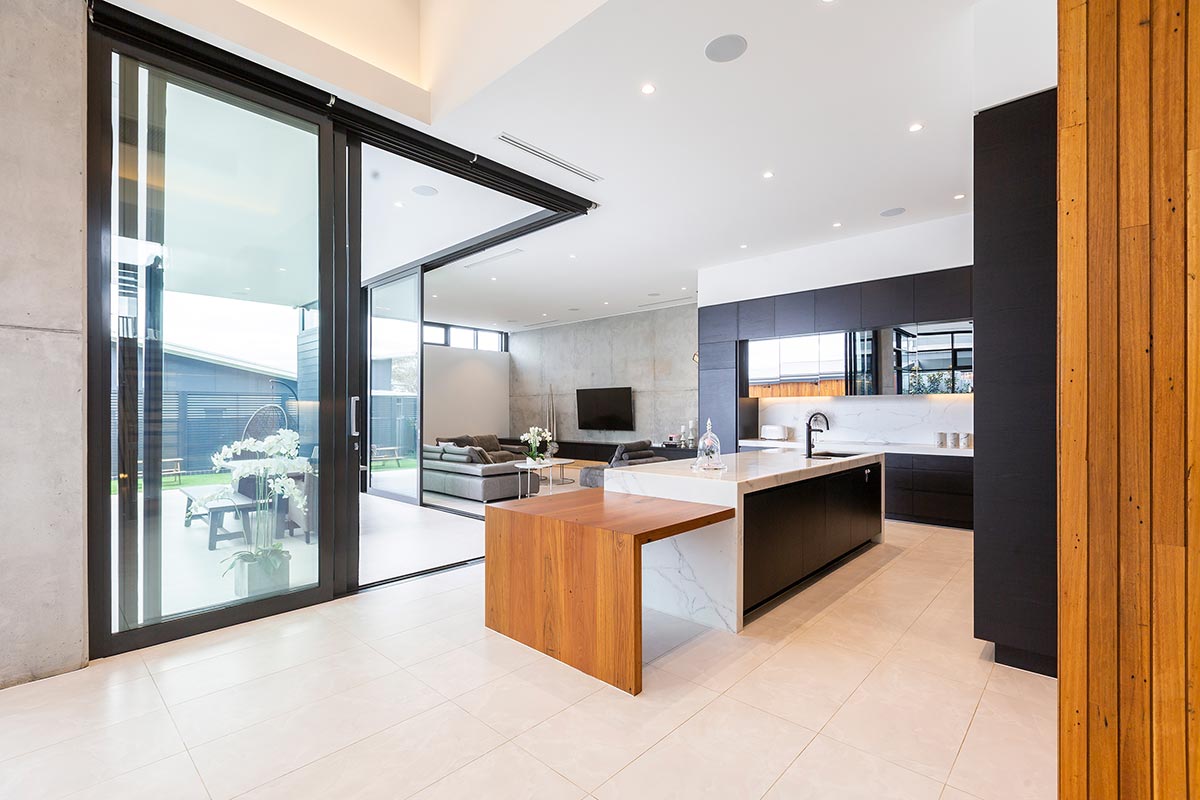 “The master bedroom- retreat and the garages are accessed from the main entry level. The children’s bedrooms are at the upper level, whilst the main living spaces are stepped down