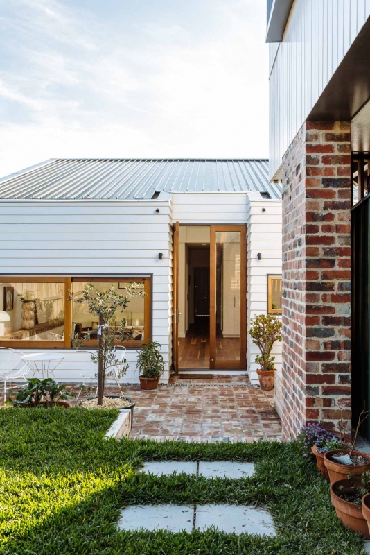 Taking design cues from the existing structure, the new works are a reinterpretation of the weatherboard language expressed, with a modern and warm aesthetic edge. The owners had a collection of references, which were generally all contemporary warm spaces with some element of a shared or communal feeling about them. Take the kitchen, dining and living area of the house for example, which are all side-by-side. A modern, open-plan area that acts as the heart of everyday living and entertaining.