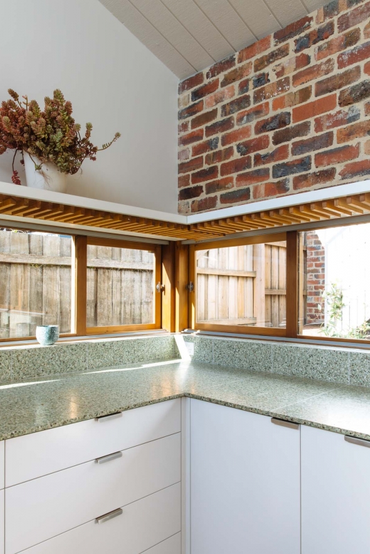 Both the studio and house frame the outdoor dining area and garden. Whilst the exterior views are intentionally minimised to improve the thermal performance of the space, they’ve been well-framed to create a strong connection to the backyard as well as achieve an intimate kitchen area with great natural light.