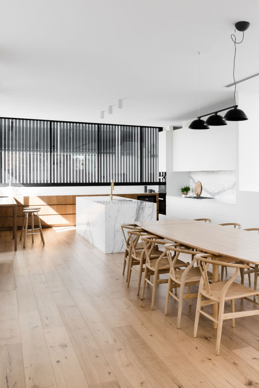 The two external voids extend from level two to ground, creating an opportunity for windows to allow natural light into each room. These also create visual connectivity and link the house vertically with beautiful light wells, while creating opportunities for natural ventilation.