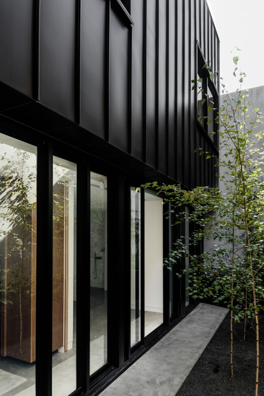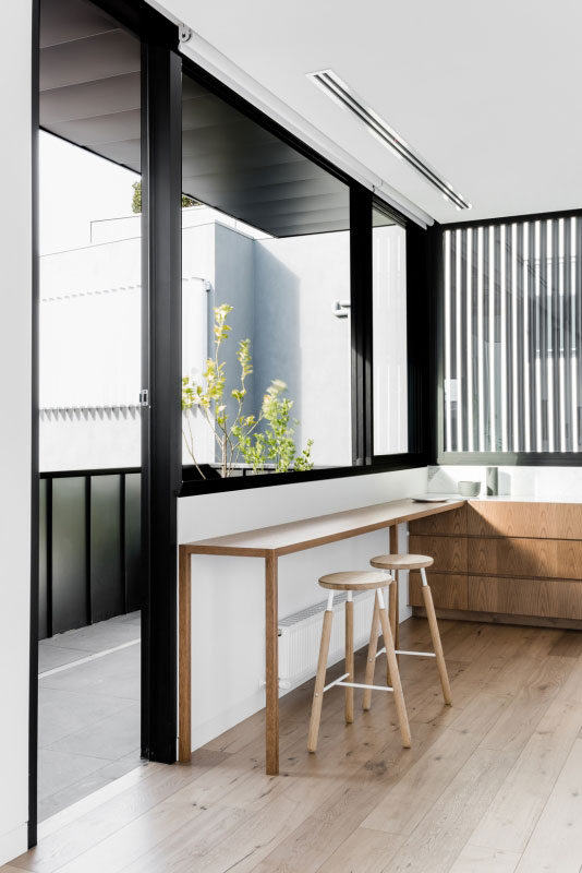 The traditional planning of the home has been inverted with living spaces on the top floor and bedrooms and utilities below. To open the internalised site outwards, vertical incisions were cut into the vertically-stacked design. The strategy was not just to make this large, rectangular volume a habitable space, but one with views to the natural environment and natural daylight from vantage points within the house.The top floor living terrace and herb garden enjoys views over the surrounding rooftops to the North Melbourne Town Hall and the city beyond, while still remaining protected from the nearby neighbours. Natural light has been channelled into the lower levels via vertical lights wells and an east facing courtyard garden.