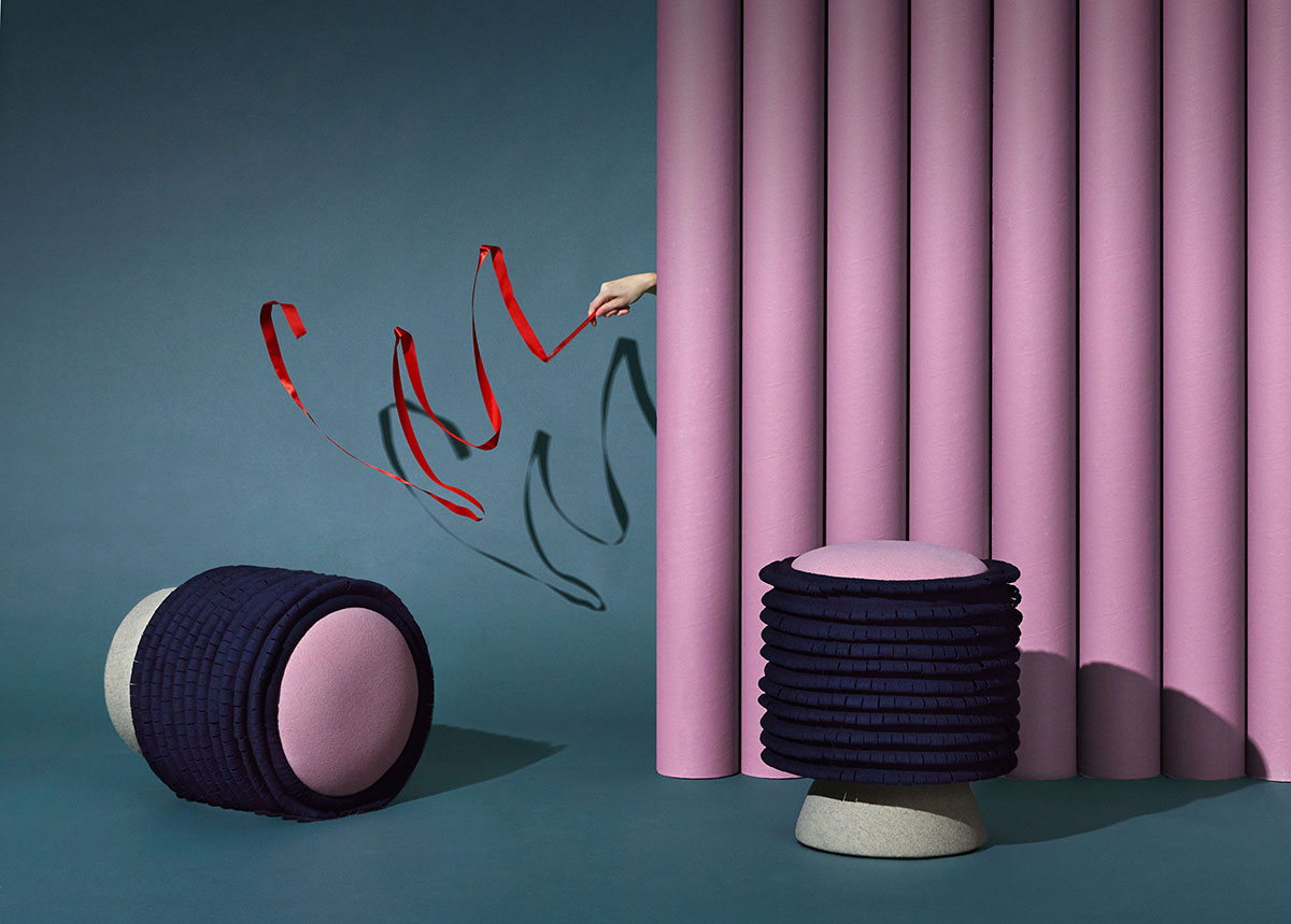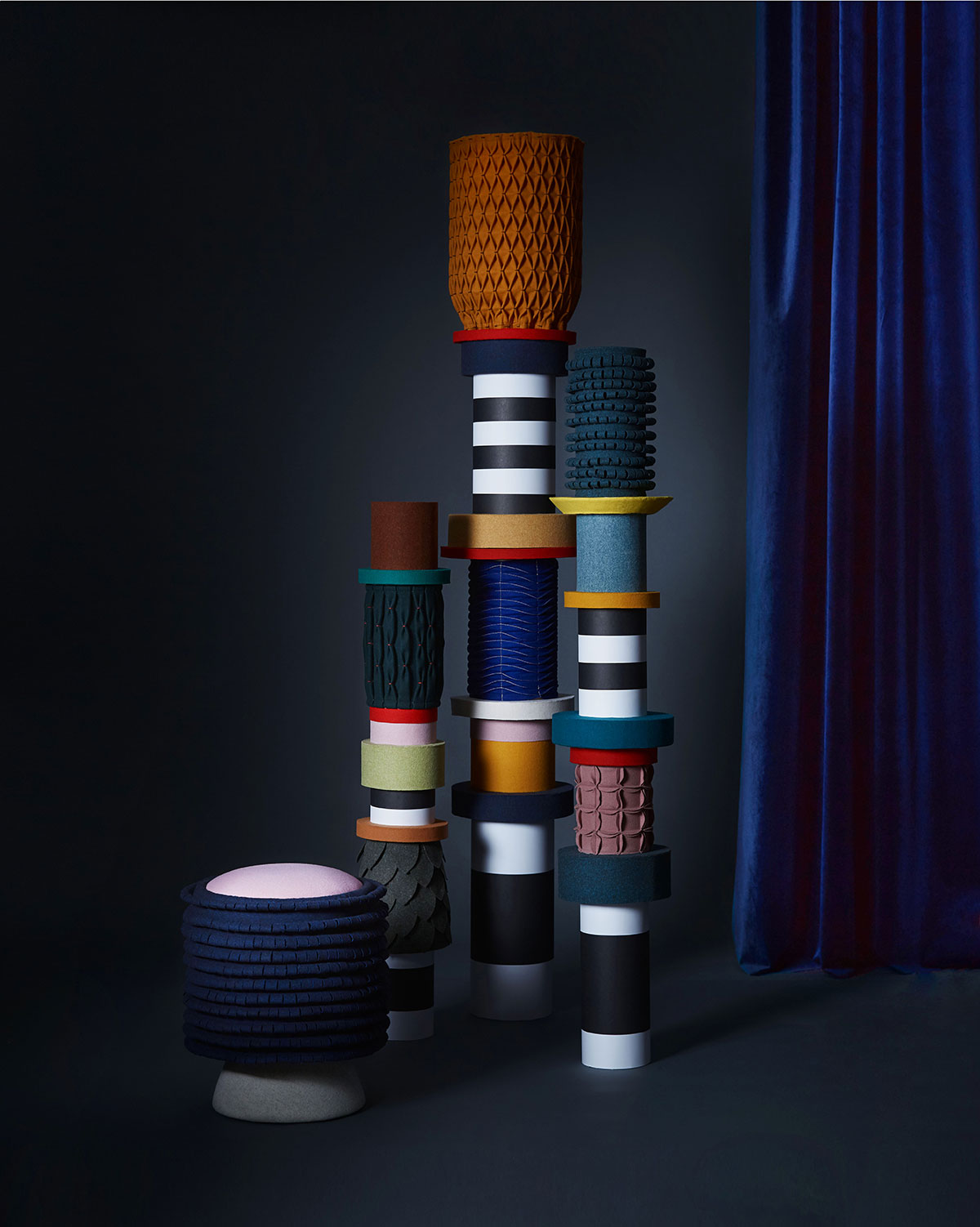 The Totems familia. They were genuinely born out of free experimentation with the burel textiles, form, scale, texture and colour to produce tactile and visually engaging sound-absorbent vertical elements. They explore the emotional/expressive side of design.