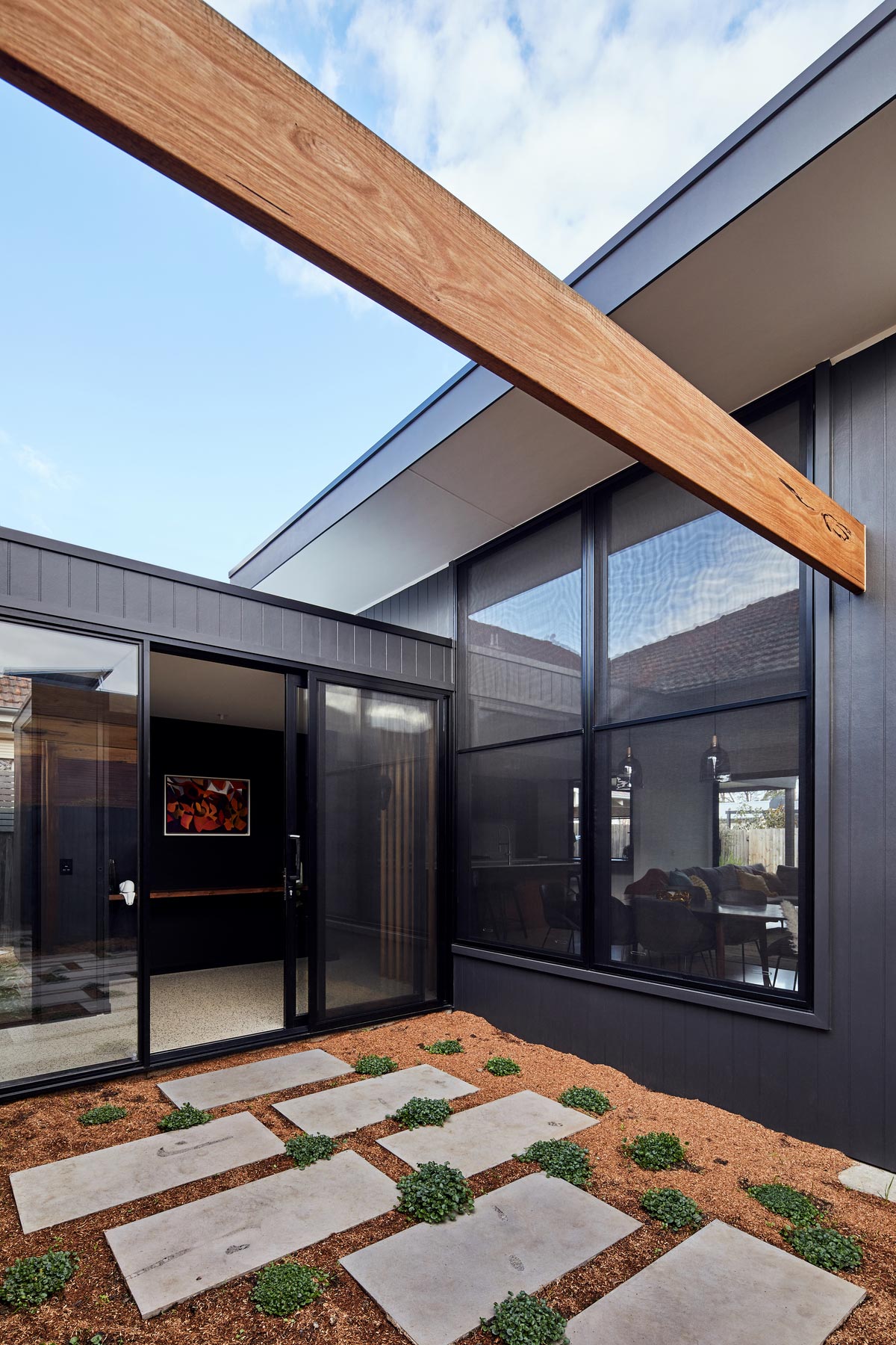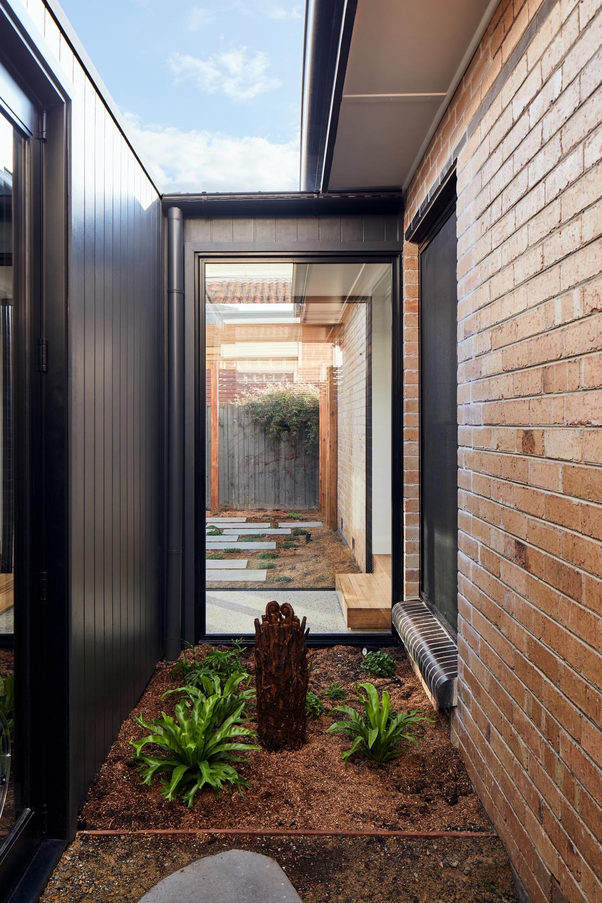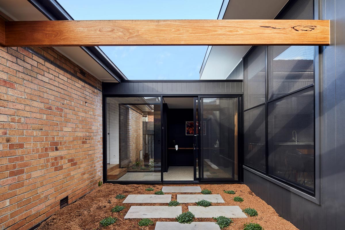 “The design was based around the existing post war, brick veneer home which was in great condition. This original portion of the home houses the bedrooms/sleeping areas. The modern extension to the rear touches the existing home lightly bringing the outside in. With expanses of glass and a Skillion roof reaching north the light in the space is pretty special. The separation between the old and new buildings allows for garden space in between, creating a sense of being surrounded by green.” – Altereco Design