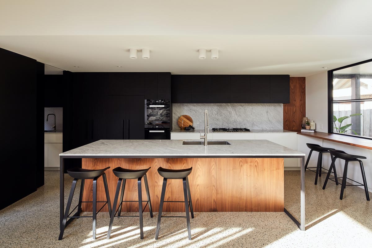 A restrained, natural material palette of solid timber details, dowel battened screening, and fine handcrafted joinery elements in the living and kitchen create warm and inviting interiors that offer a sense of being in and surrounded by the natural world. This also signifies the meeting of classic and contemporary that allows for a welcoming series of spaces with robust and practical seamlessness.