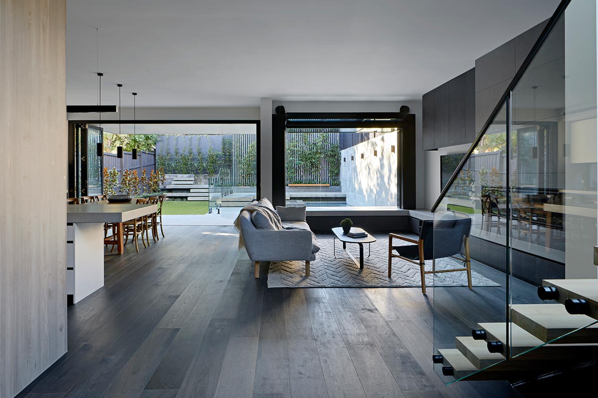 “Our response was to continue the width of the existing entrance hallway with a feature staircase/wine wall and internal light court, which in turn leads to the open planned living room, kitchen and dining area with north facing bi-folding doors that open up to the backyard. One feature of the living room was the counterweighted split fold window, which creates an uninterrupted view from the in-situ concrete seat.” – Chan Architecture