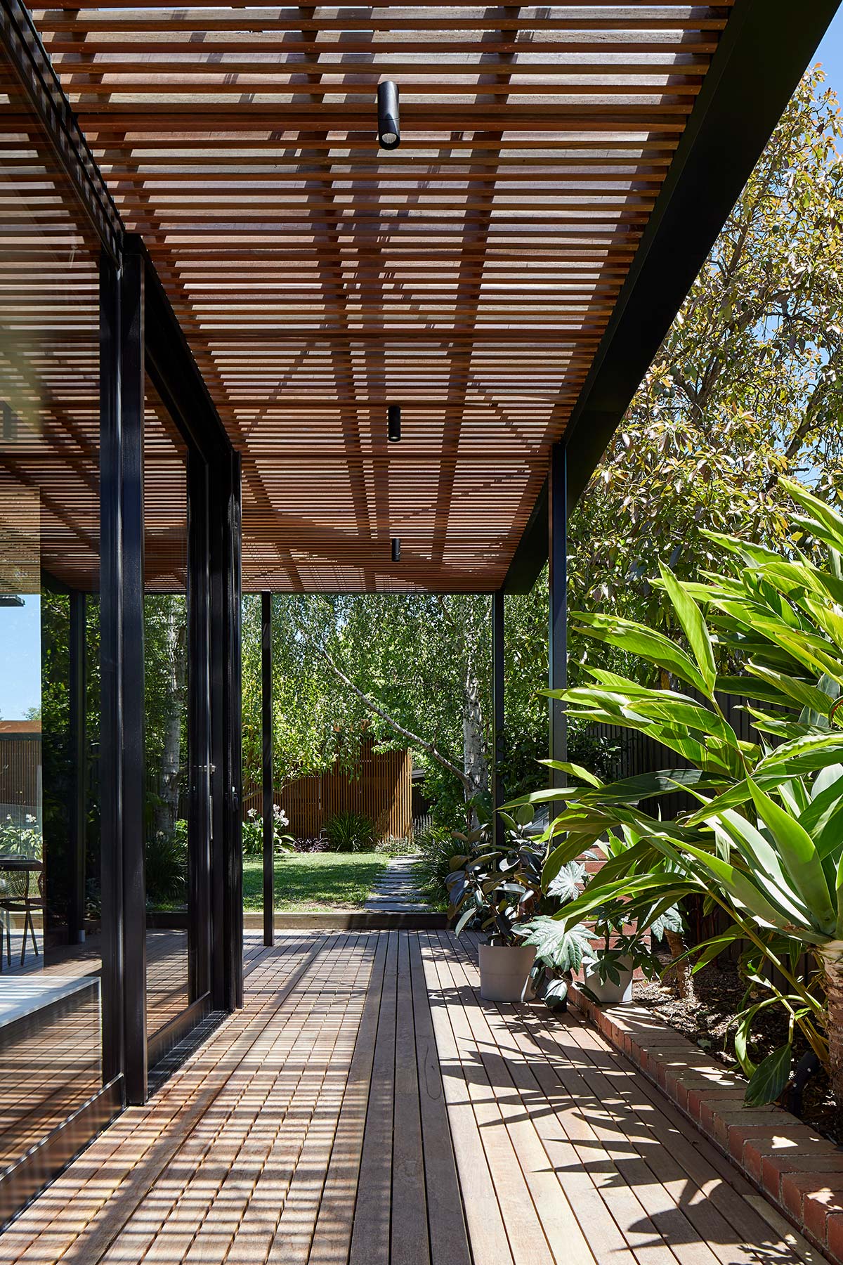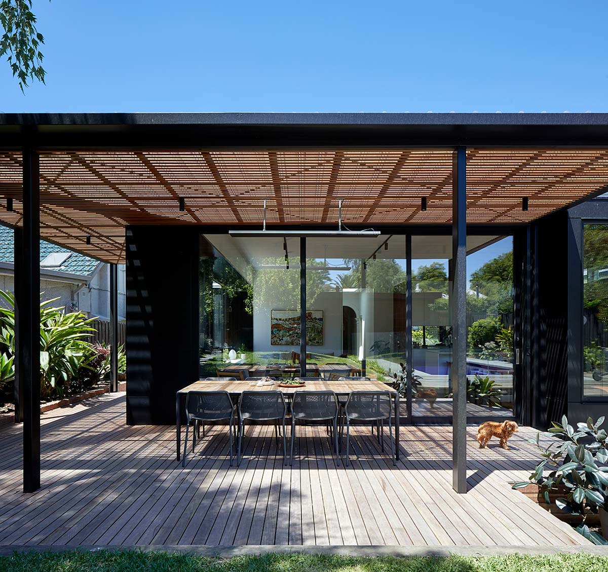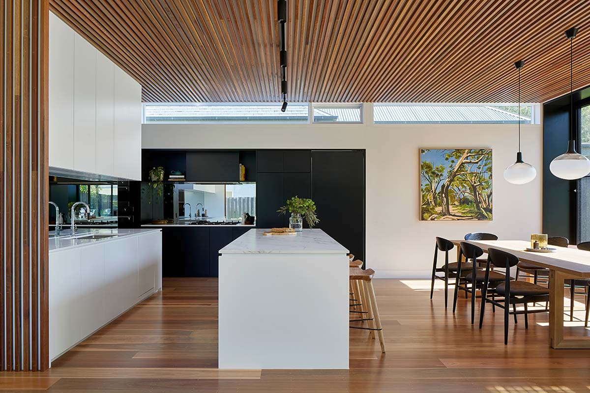 “The material pallet was kept minimal and raw: Australian hardwood timber battens, flooring and veneers with white plasterboard, matt black and matt white cabinetry, marbled porcelain benchtops and plinths, mirrored features, custom black steel detailing, and large expanses of glass. Externally, the new minimal additions clad in matt black sheeting and slim-line steel and timber veranda, are viewed as robust contemporary additions to the heritage house.” – Kuzman Architecture