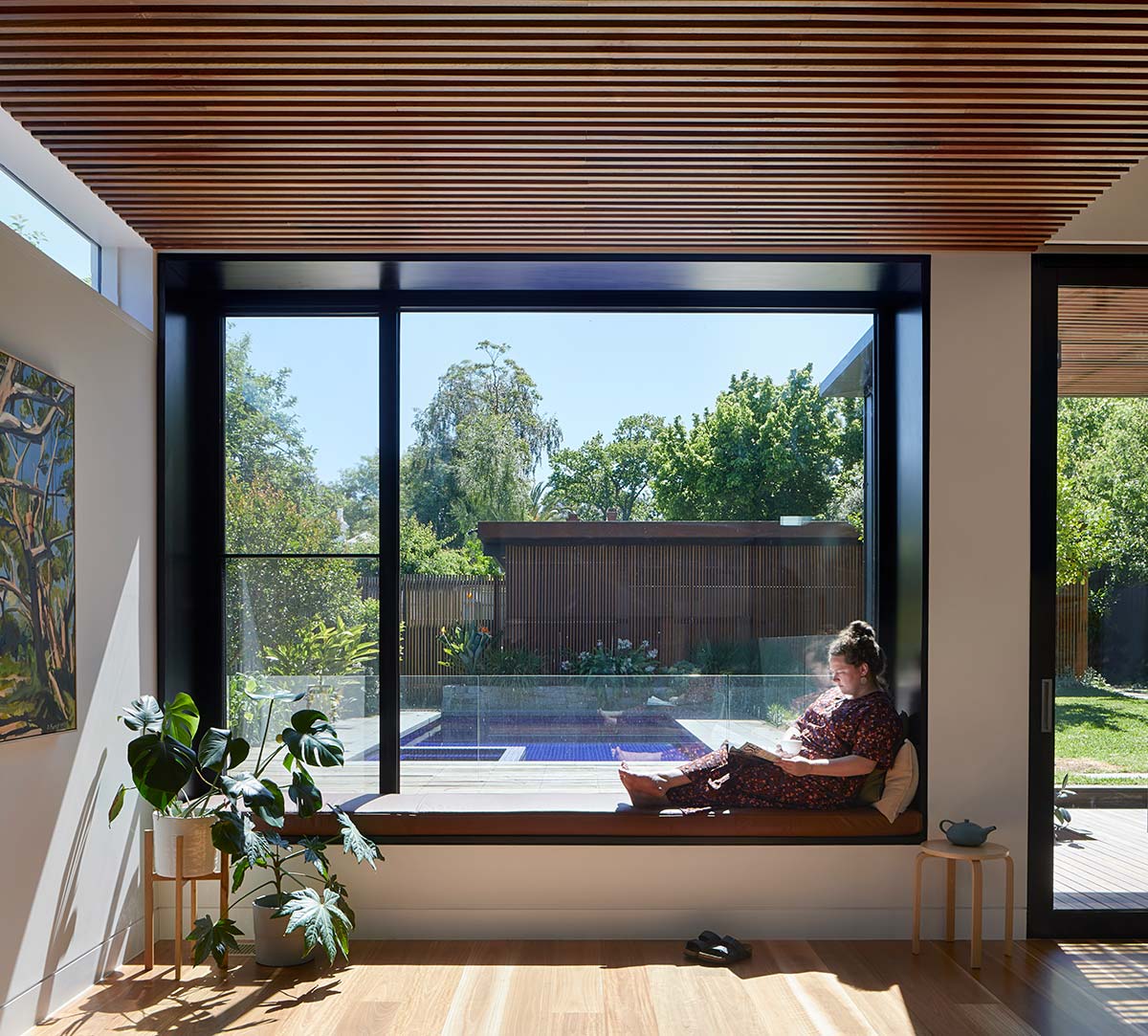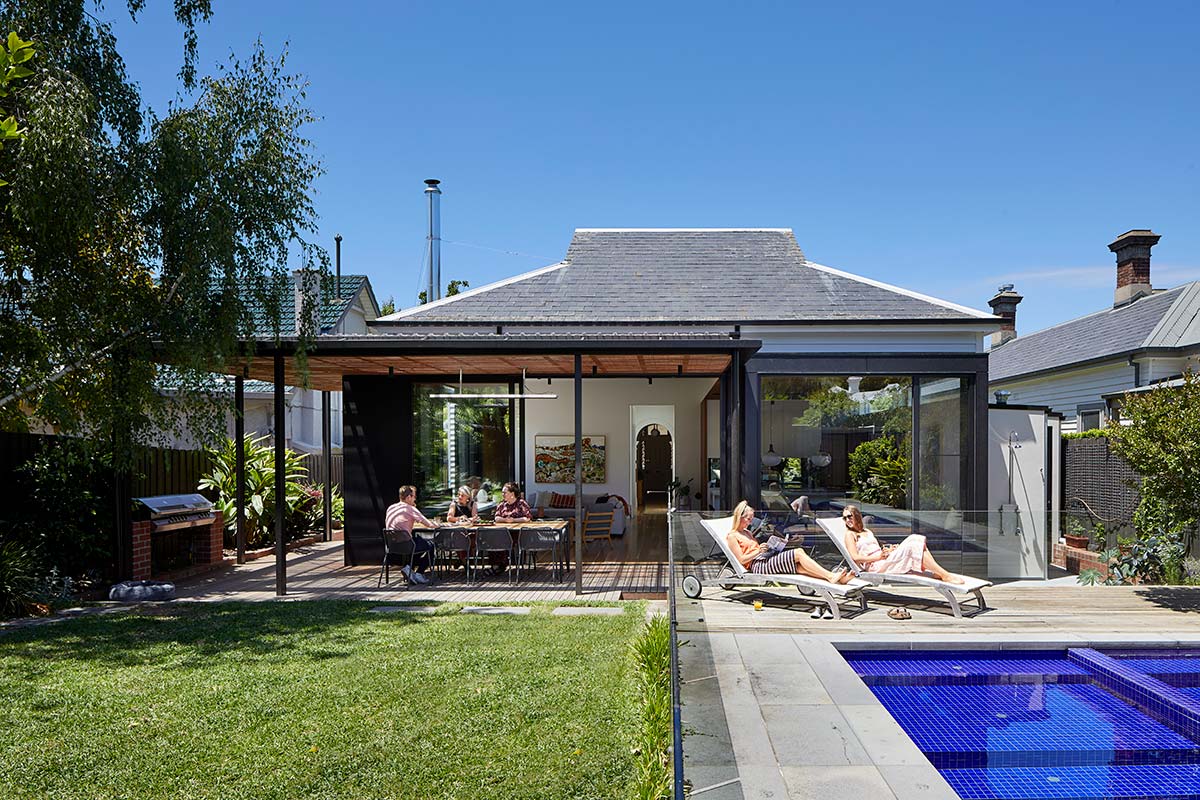 “The rear area of the house was a 1990’s replica addition that lacked spatial connections and atmosphere, had poor thermal qualities, little natural light, and restricted views and physical connection to the garden and pool. The kitchen was too small, the out-dated laundry and bathroom intruded into the floor plan making awkward spaces in the living areas, and there was no dedicated dining space to facilitate the owners large extended family gatherings.” – Kuzman Architecture