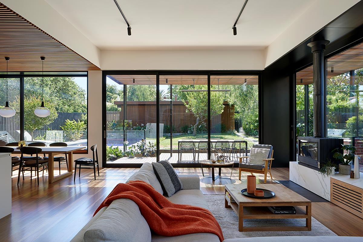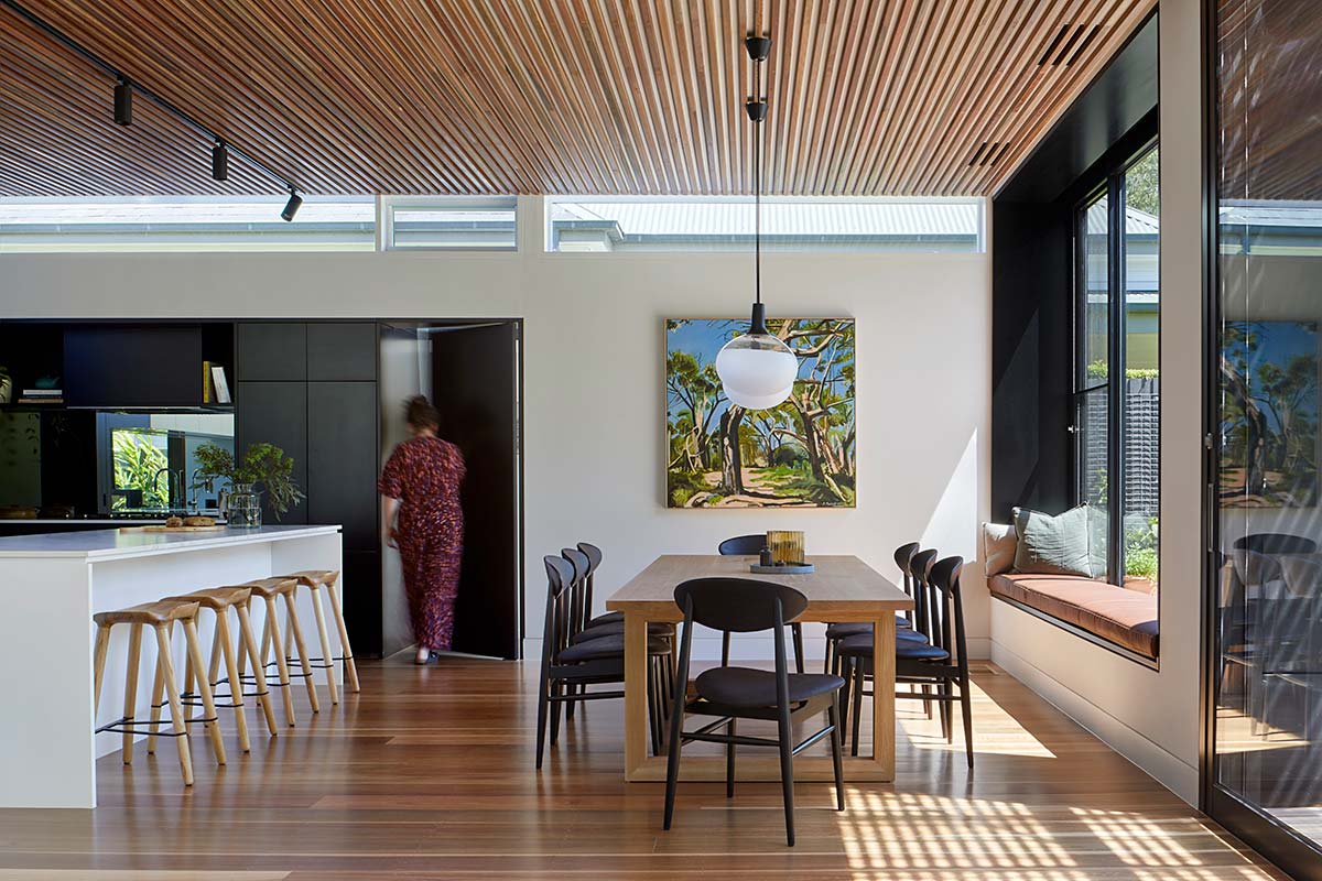 The generously proportioned 1990s addition was the starting point in creating an efficient layout by using the existing footprint with minimal new additions. Internal and external walls were removed leaving only the floor structure and tiled hip roof form to design within. The transparency of the new doors and wall glazings allows ample natural lighting to flood the interiors and also grants a perfect passageway for ventilation throughout the living spaces.