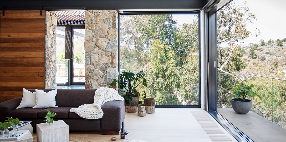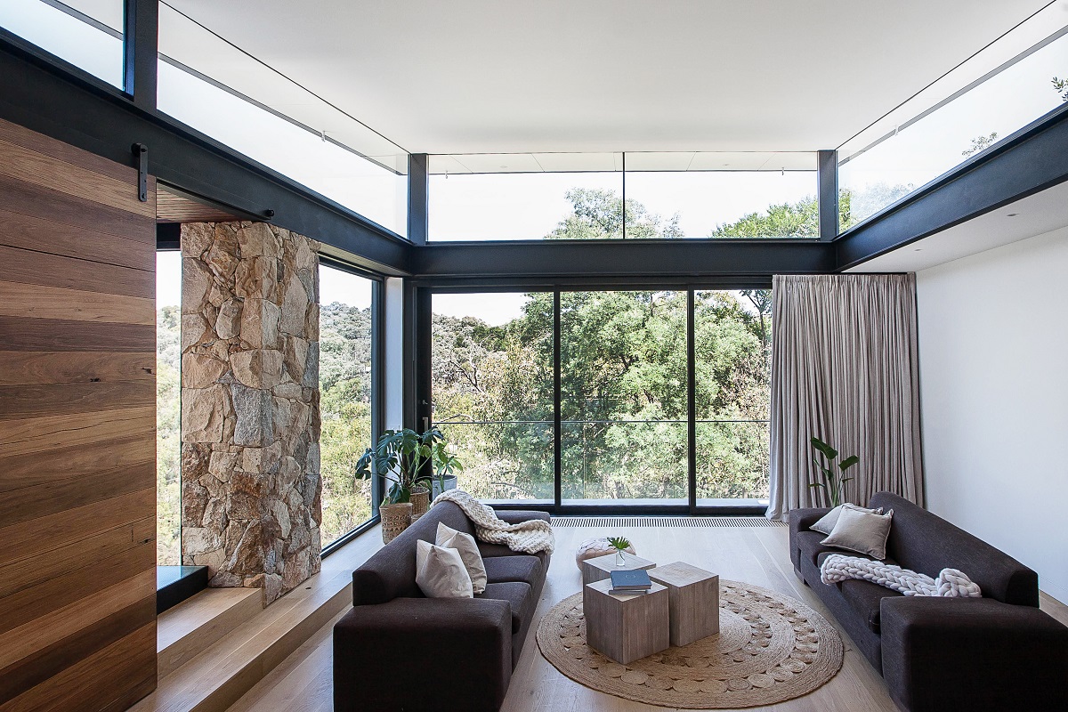 Combining stone and timber with contemporary construction materials including glass and steel the dwelling takes its cues from the material character of the rocky and forested surrounds. Naturally finished stone walls bring tactility and warmth to the interior and allow the exterior of the building to gently recede into the bushland setting.