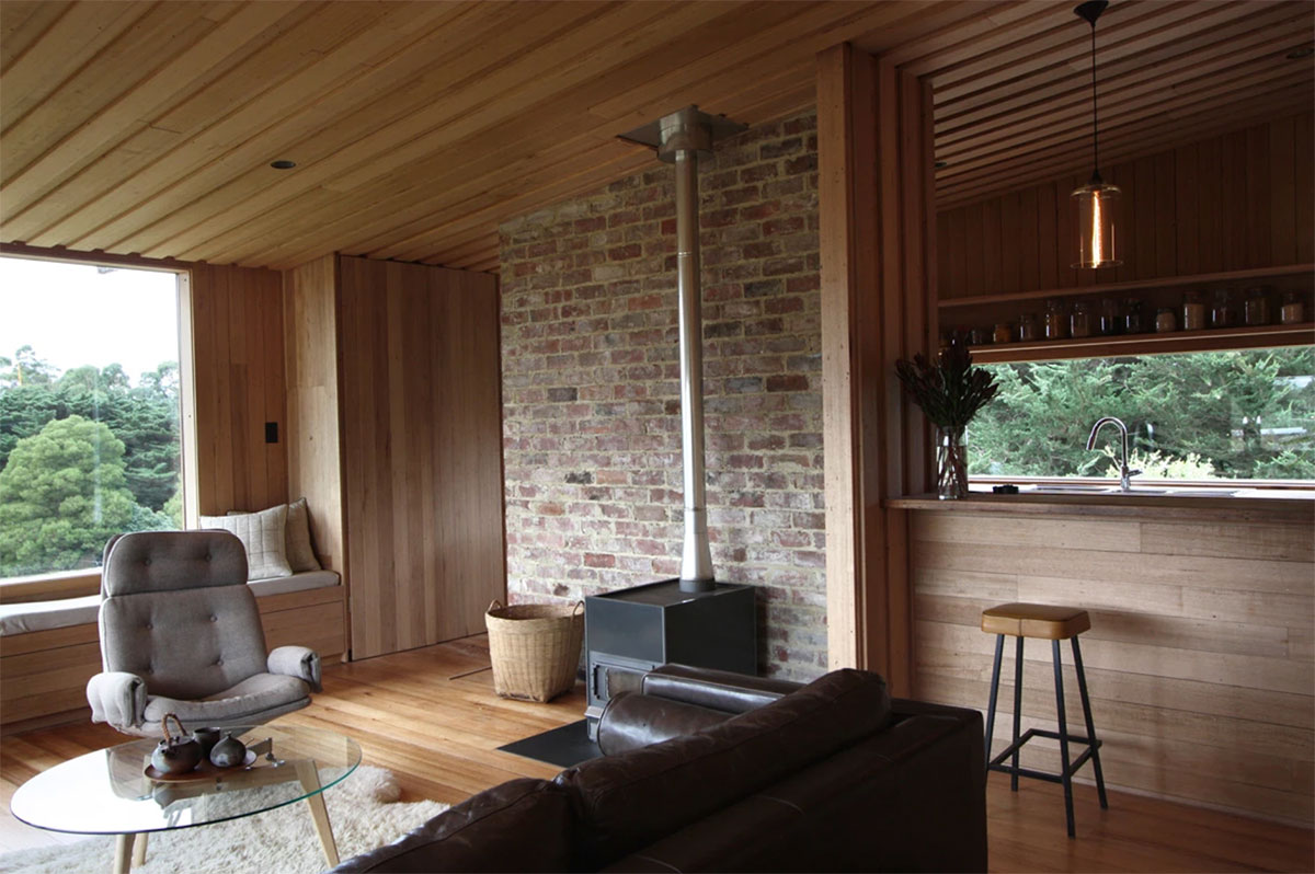 The bespoke interiors are mainly composed of reclaimed hardwood and the history of which adds warmth and character to the space. Soft timber panels create nostalgia whilst black steel fixtures modernise the aesthetic, creating a balance of old soul and youthful energy. The kitchen overlooks the living room which is set off with exposed brick walls and black steel fireplace, creating a gravitating focal point.