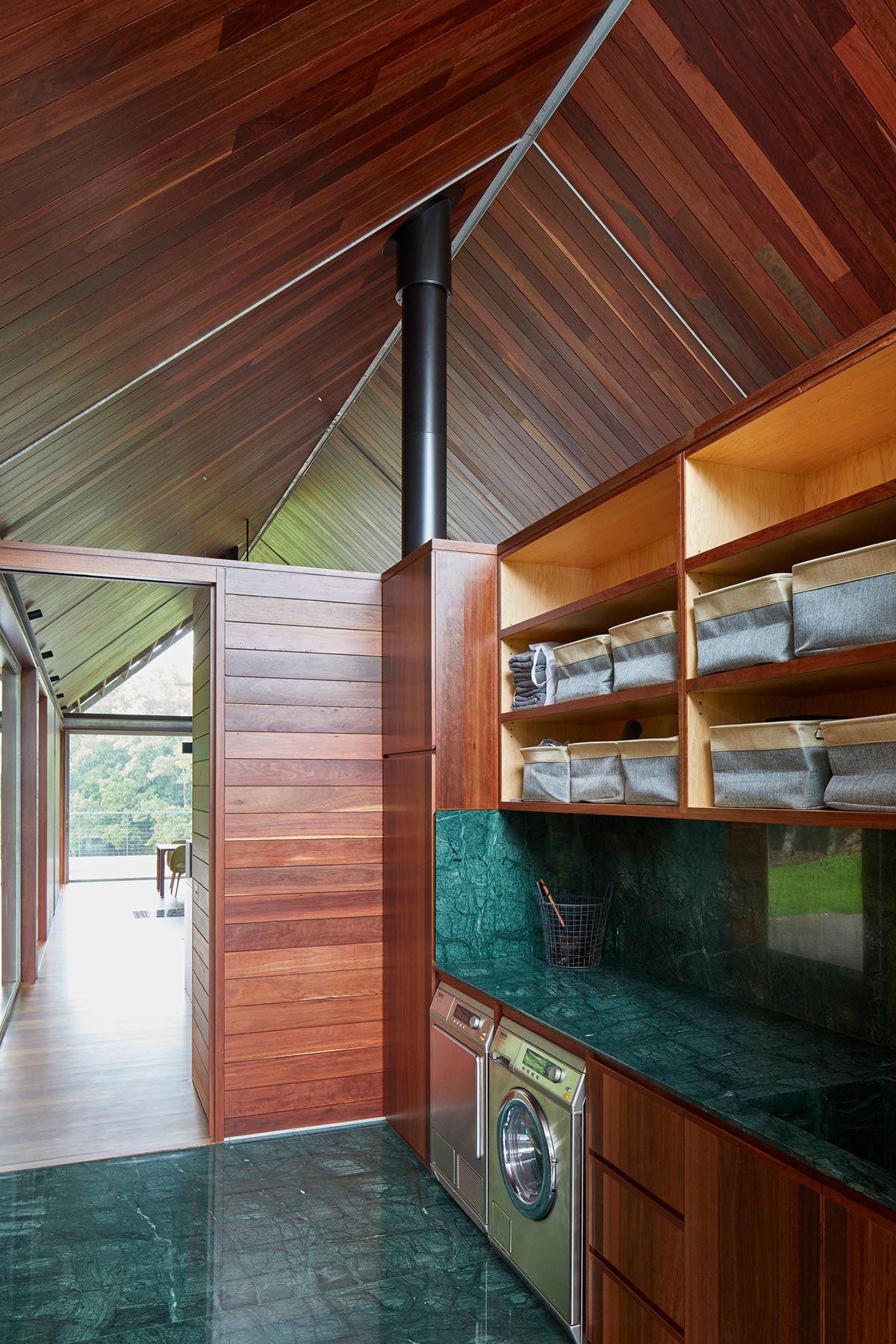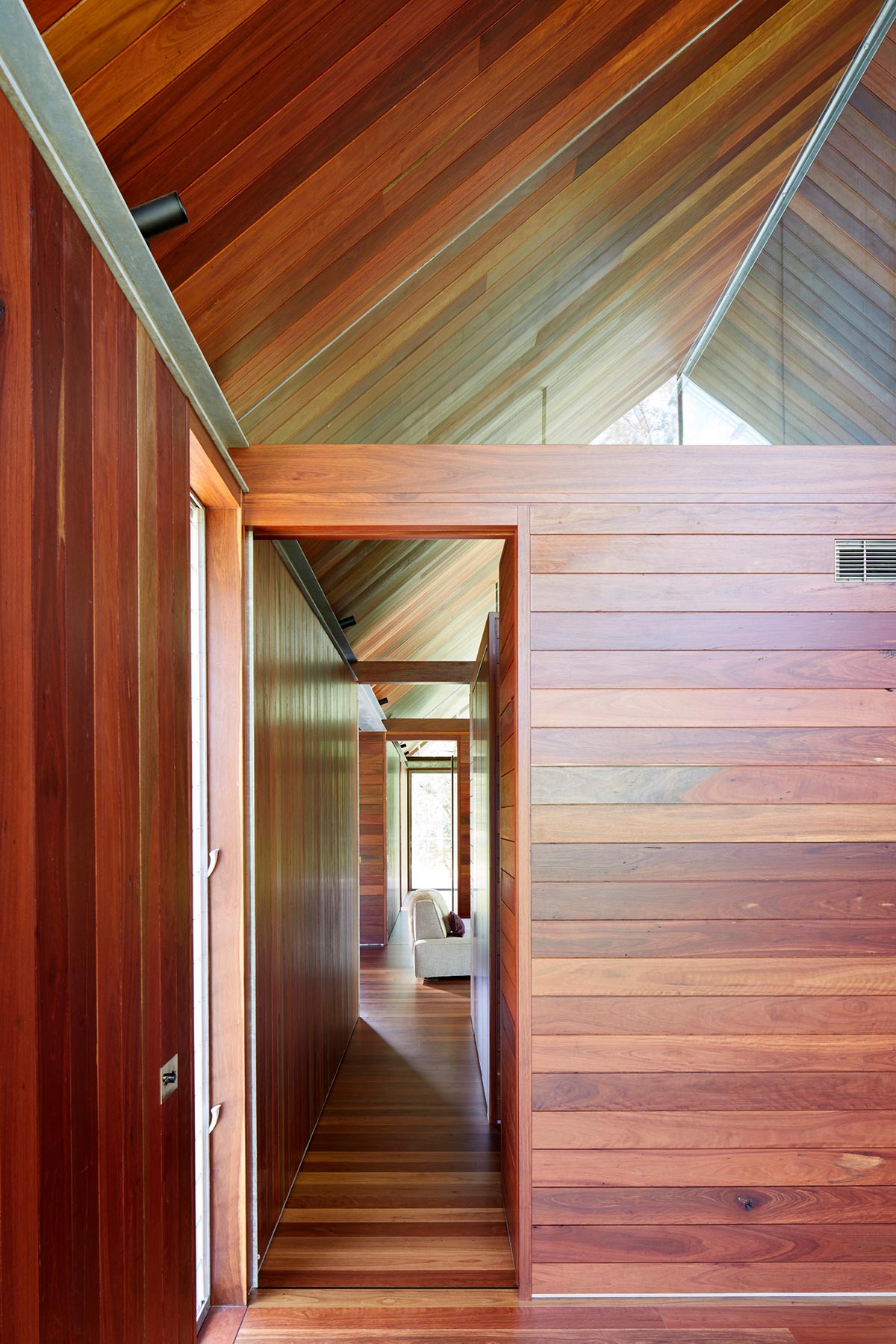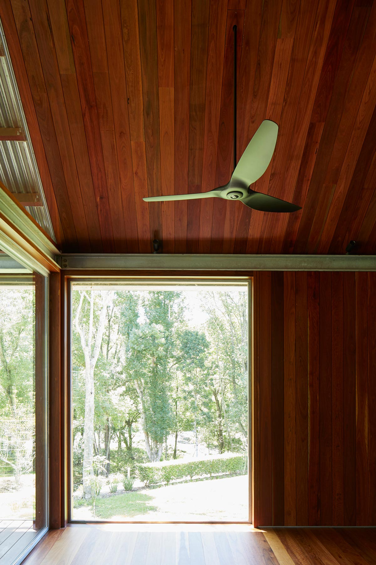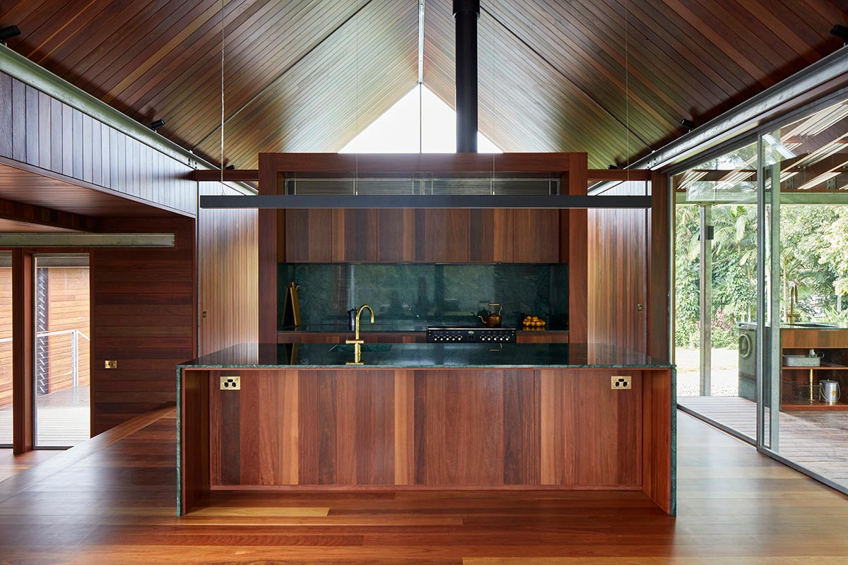 Timber elements from the exterior continually flow to the overall interior. Floor and ceiling are both clad with solid iron bark timber , while wet areas are formed in large monolithic green granite slabs and enriched in bronze detailing and fixtures. The hot dipped galvanised steel structure is revealed and articulated both externally and internally giving rhythm to elevations and interior spaces.