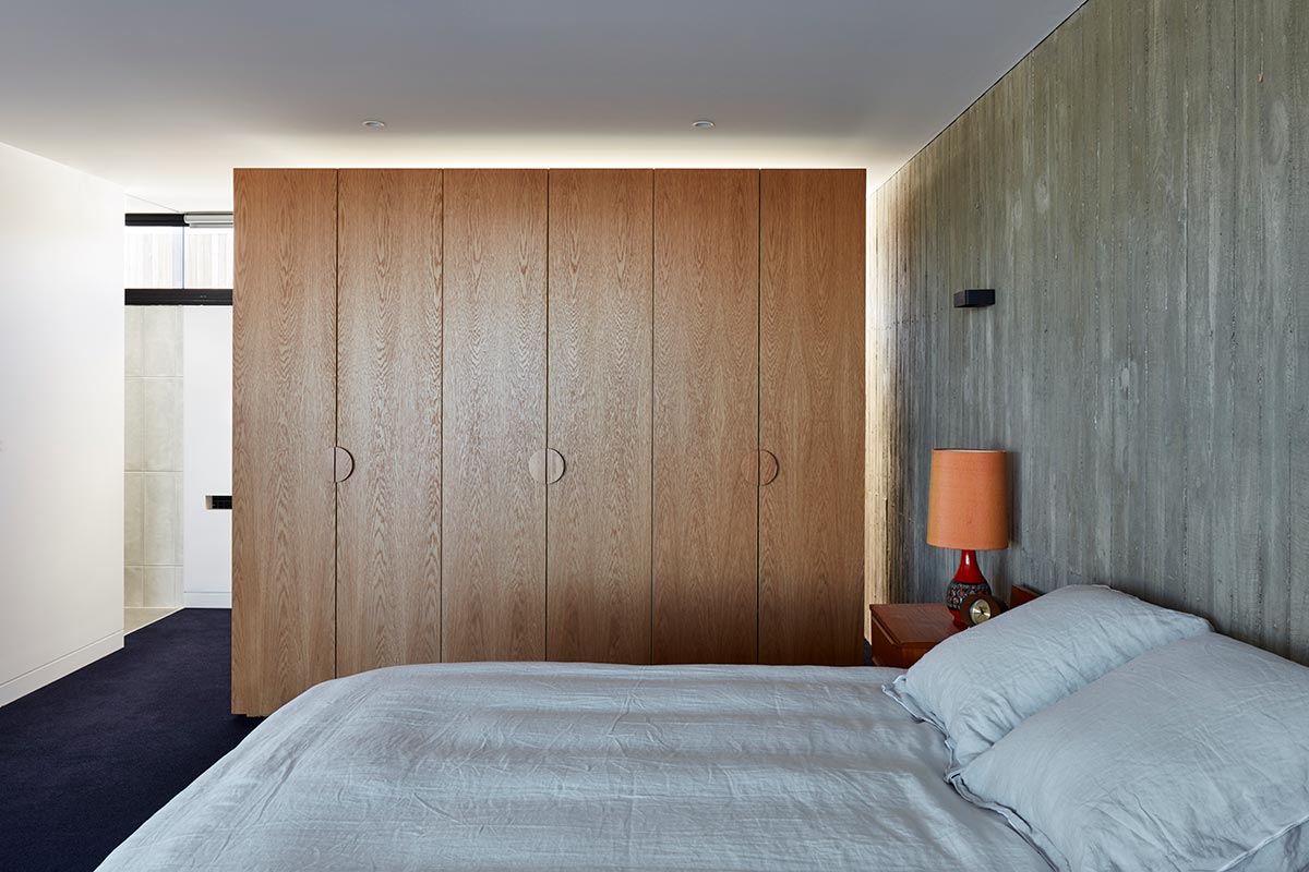 “The deep balcony and overhang provides sun protection to the west oriented main living area and vental blinds to north facing windows assist solar control. As a weekender home, ceiling fans were favoured in most rooms and air conditioning used rarely due to effective cross ventilation with full height glass sliding doors. The combination of raw timber and insitu concrete are low maintenance and provide longevity.” – Architects Ink