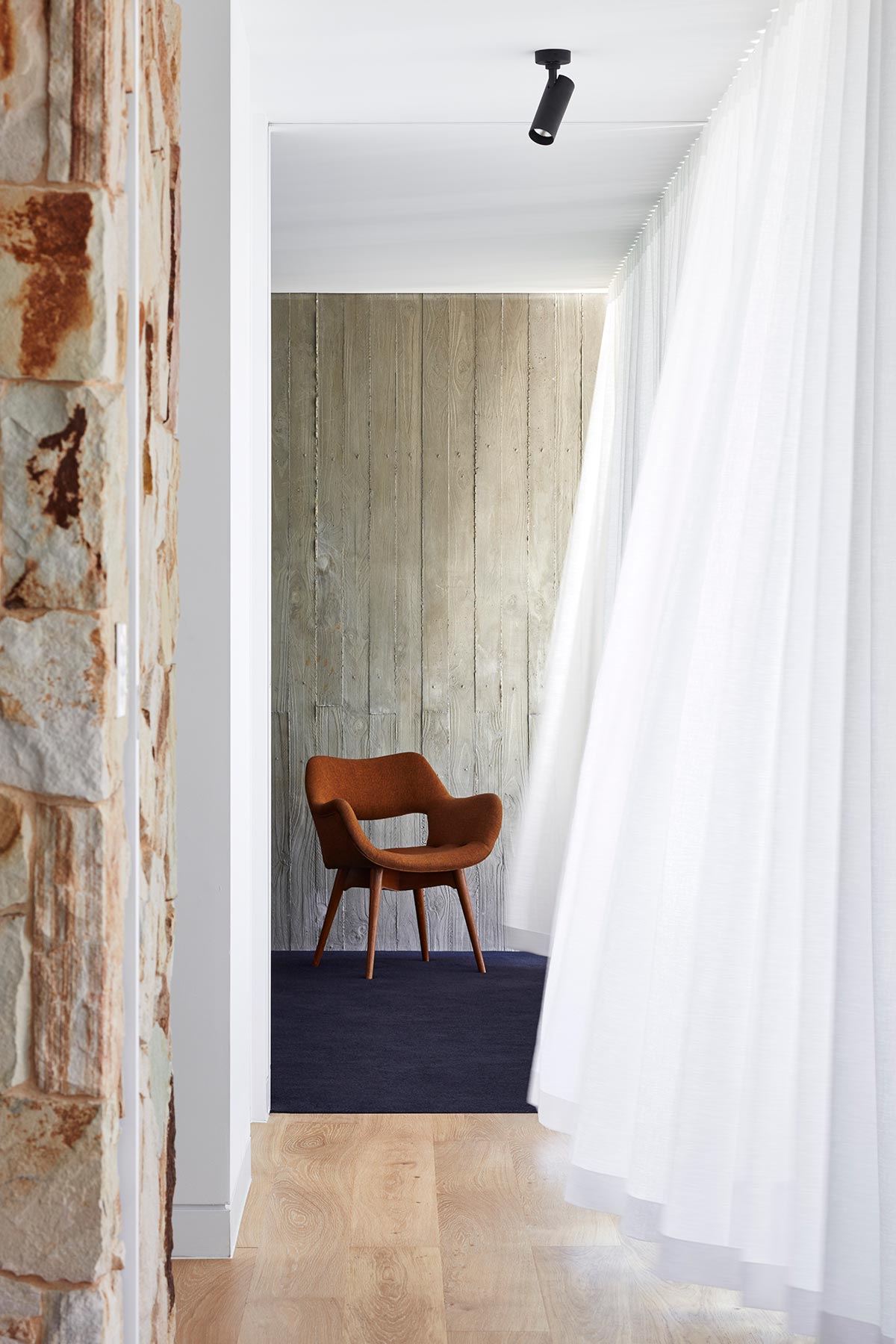 The owners’ passion for mid century design is evident on the internal finishes, lighting and custom details. Their large collection of vintage furniture and retro styling beautifully compliment freeform sandstone walls and extensive oak joinery. These interior details create a warm, homely atmosphere, while dark navy carpeted bedrooms provide a striking contrast.