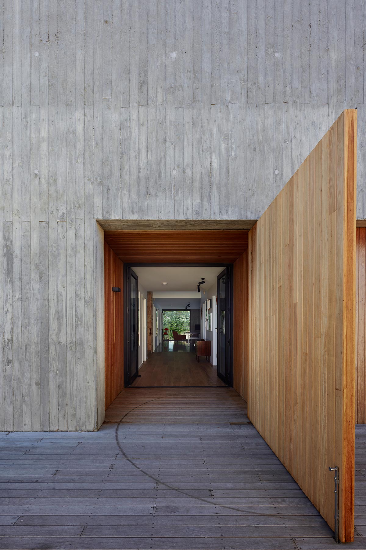 “Timber grain in-situ concrete walls have a highly textural experience that changes with the path of the sun, both internally and externally. Timber decking and external cladding softens the concrete and its raw finish that will silver over time depending on exposure to sun and rain. An oversized timber pivot door acts as a ‘gate’ to the main entrance, indicating that the owners are home or concealing the entry entirely for additional security.” – Architects Ink