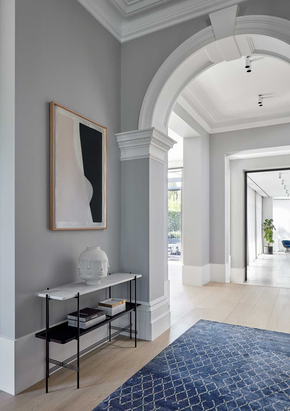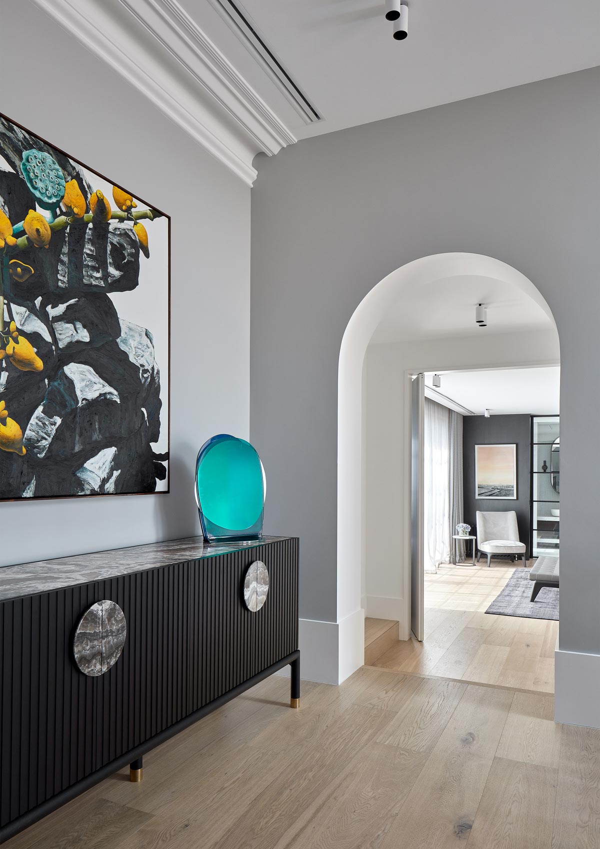 These challenges called for a new meticulously-designed layout which required the powder room to be relocated and to take advantage of the existing opening. This contemporary remodelling of the interior pays homage to the historical significance of the existing house, while at the same time adding modern splendour and creating connection and flow throughout the home.