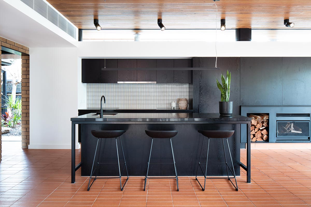 The open space plan provides all the necessary living spaces, with the kitchen considered as the centre of activity. One major problem that the original home had was the lack of kitchen storage, and the solution was to add a butler’s pantry – complete with a second sink, dishwasher, fridge and plenty of open shelving.