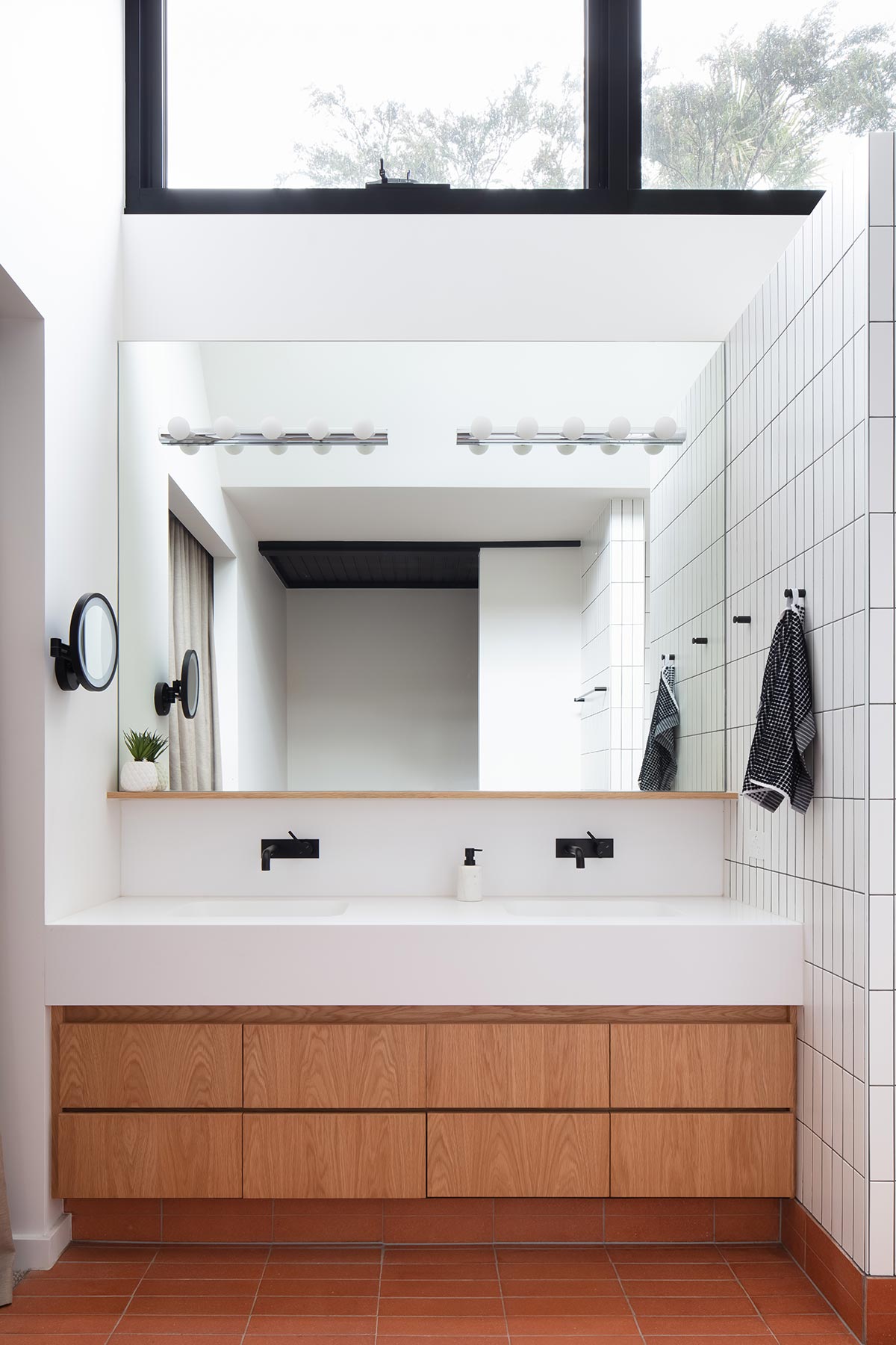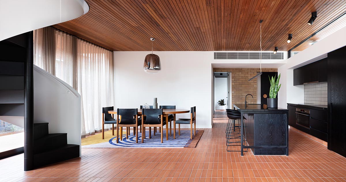 “The restrained yet rich and textured material palette takes cues from mid-century modern trends with terracotta tiles, exposed-brick walls, timber ceilings and a spiral staircase. The result is a comfortable and appealing family home that respects, celebrates and expands upon its original qualities, while providing every amenity for modern family living and ensuring it will be around for many more decades to come.” – Modscape