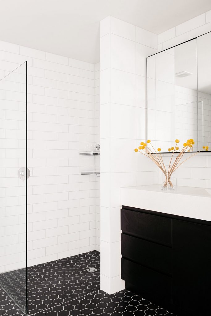 Bathrooms are kept equally bright with the help of windows and mirrors. Pre-dominantly white tiled walls make the bathrooms appear larger in scale but the flooring and material choices differ in each to create an interesting contract between the two bathrooms.