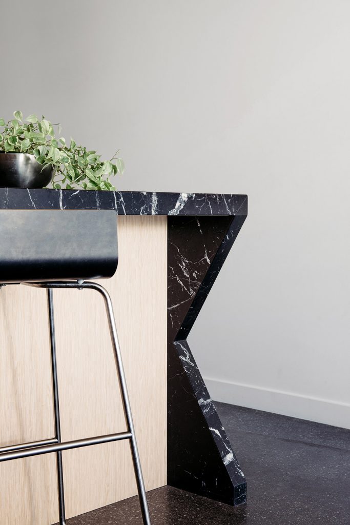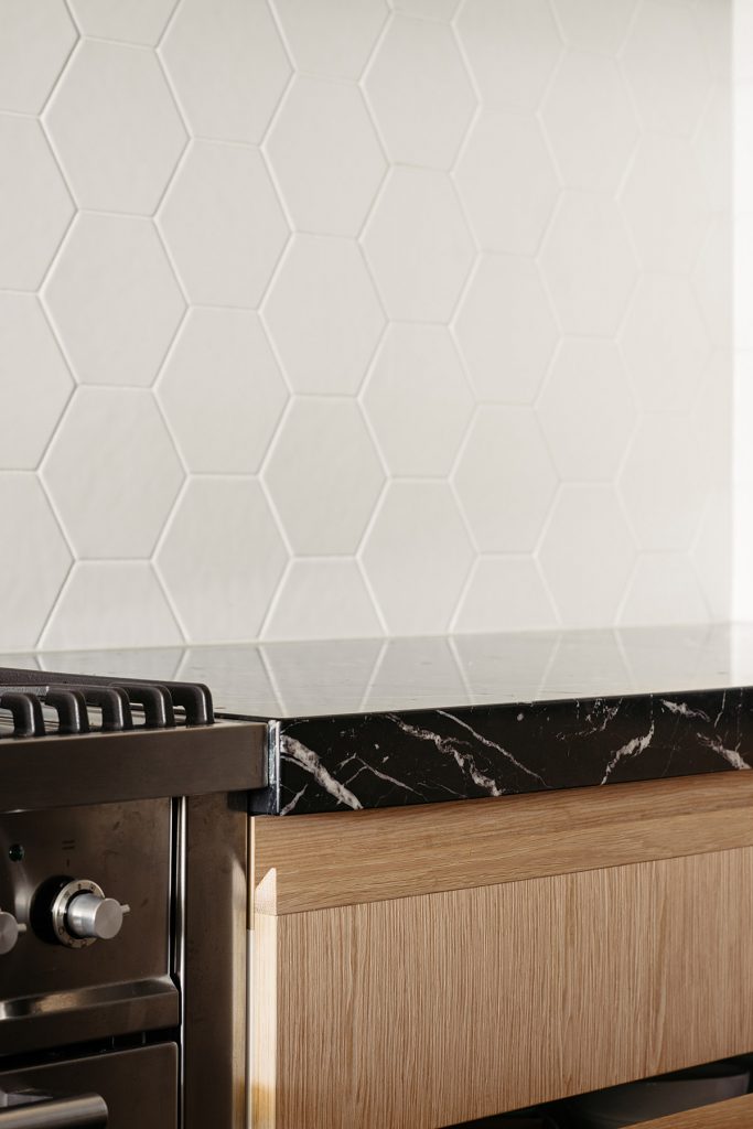 The kitchen unravels a whole new atmosphere. Its elegant timber cladding around the walls, cupboards and nearby built-in storage spaces unfolds elegantly, creating a stark contrast from the bright white neighbouring hallway. The kitchen islands are rich in texture with dark marble countertops paired with white octagonal tile splashback. This bold dark surface of the countertops plays beautifully against the strength of the black steel window frames in the living room. Be still my beating heart!!