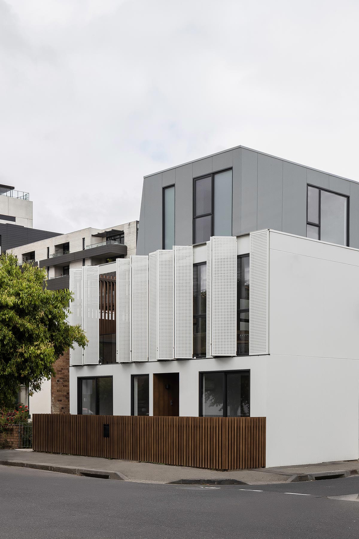 “The material palette of the design is simple and minimal. The houses are clad in fibre cement sheeting and predominantly painted white with some touches of grey on upper level. Engineered timber floor and oak veneer wall lining are used extensively to bring a sense of warmth into the interior to contrast with the hard surface of the perforated metal screens.” – Pitch Architecture + Design