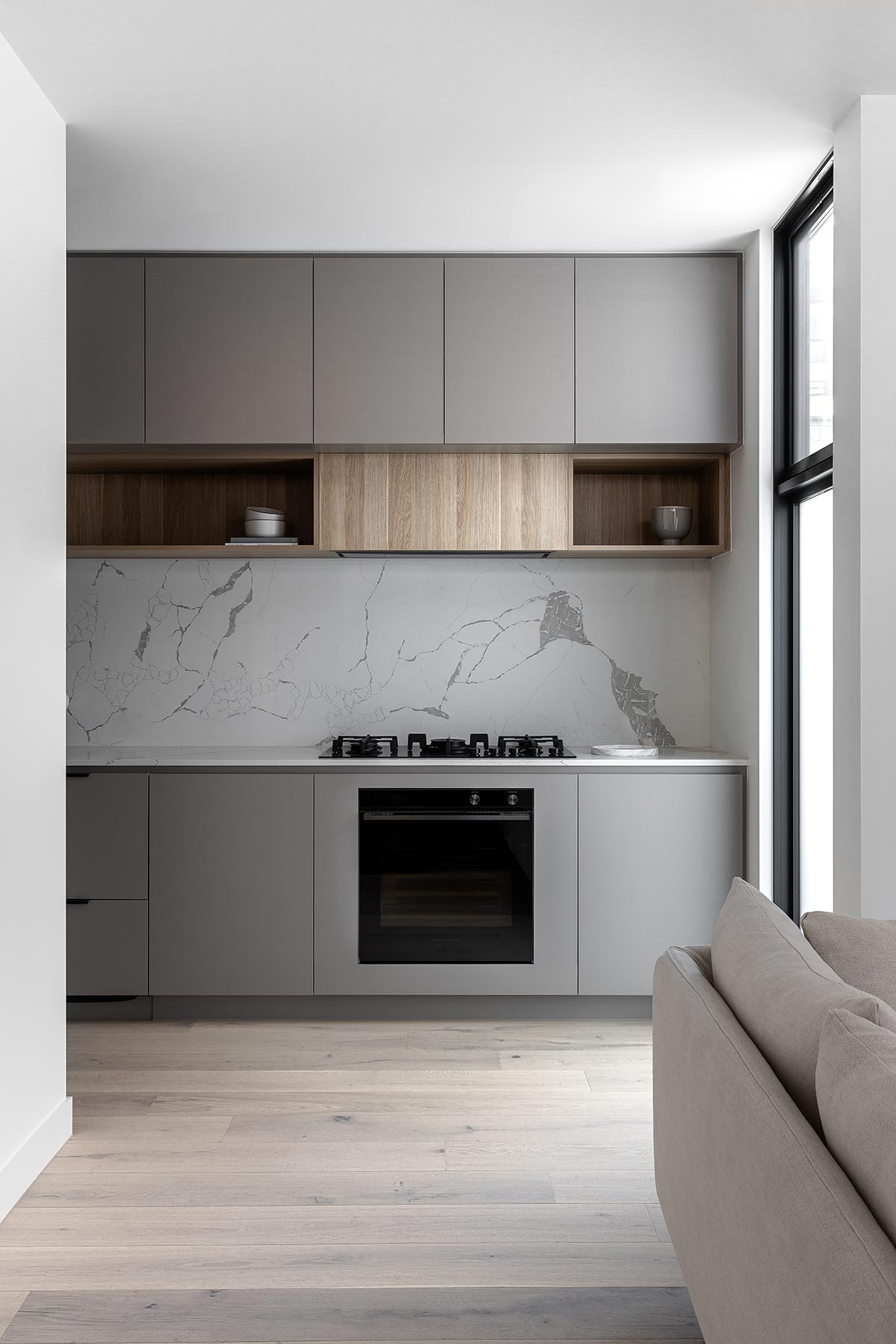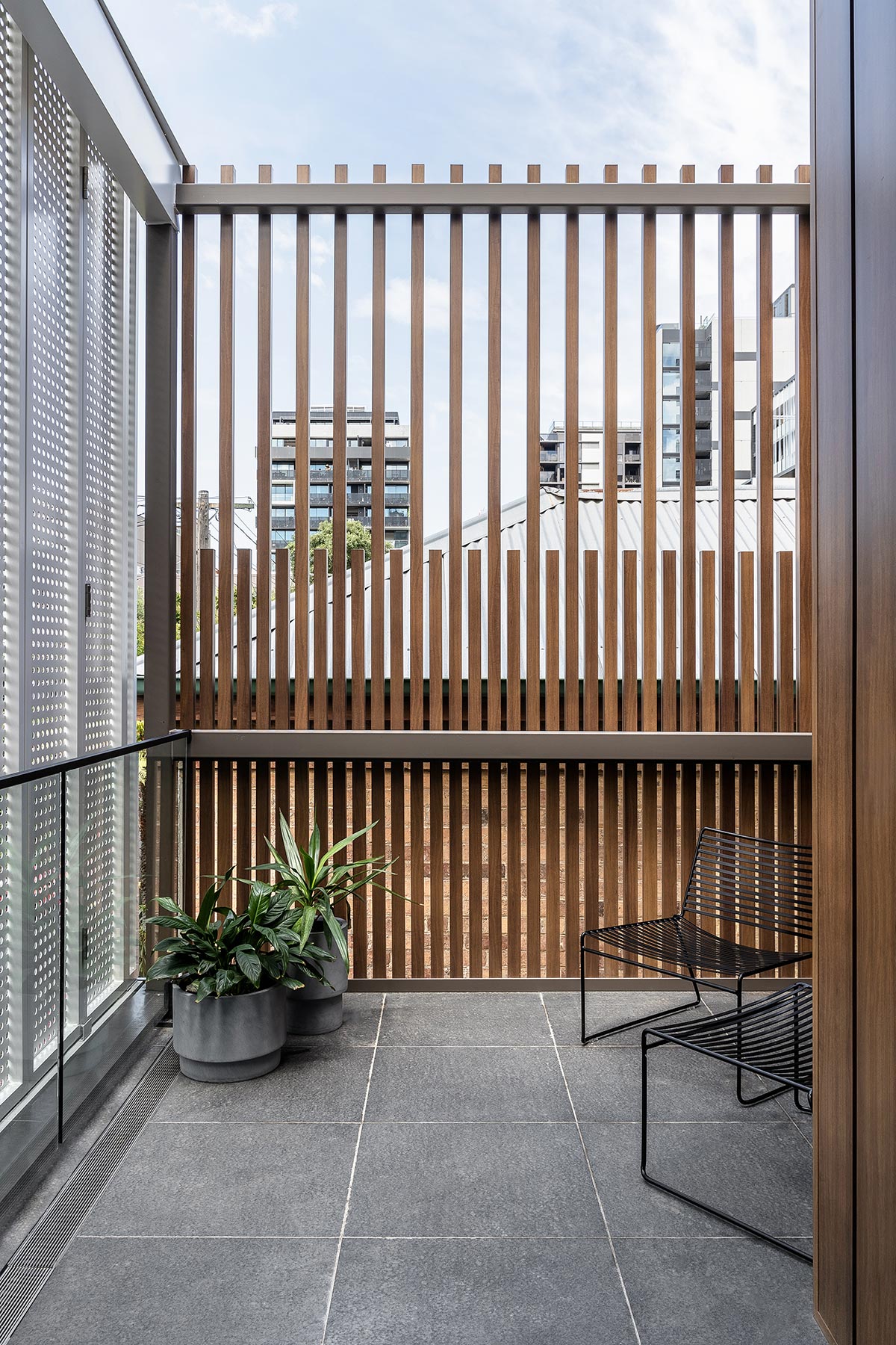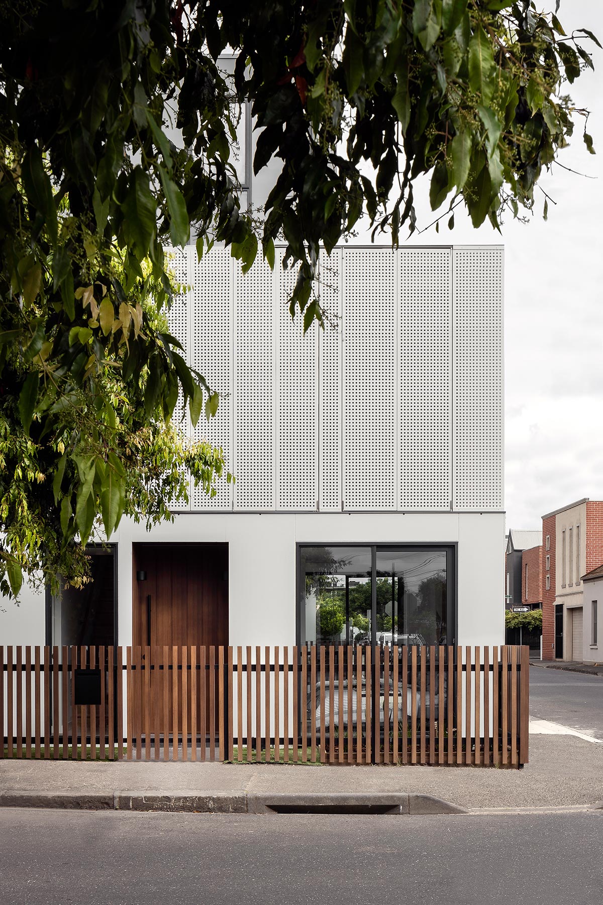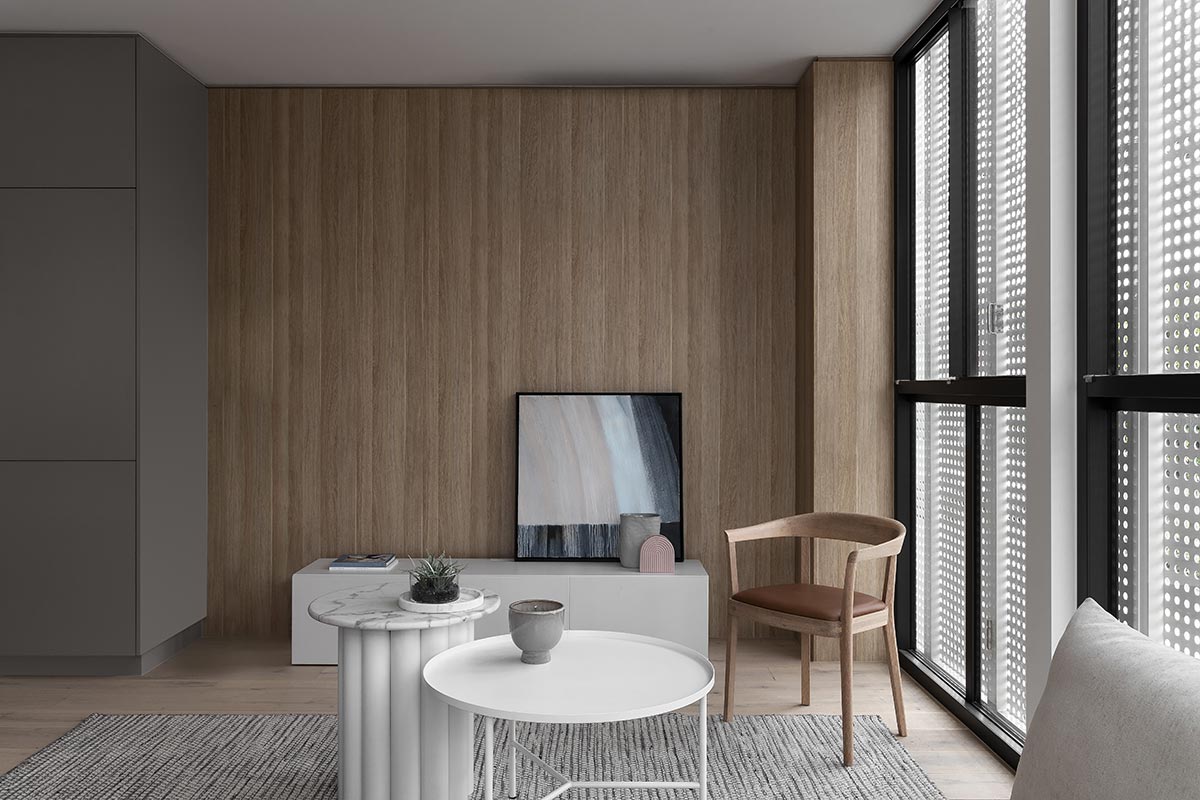 “To maximise the outlook and natural sunlight, the main living spaces for both units are positioned on the first floor, looking straight onto the streets. With floor to ceiling windows and fairly exposed living rooms, a perforated bifold screen is incorporated to add a layer of flexibility and privacy when needed. The bifold screen provides a good level of privacy while filtering through adequate amounts of natural light even when they are closed.” – Pitch Architecture + Design