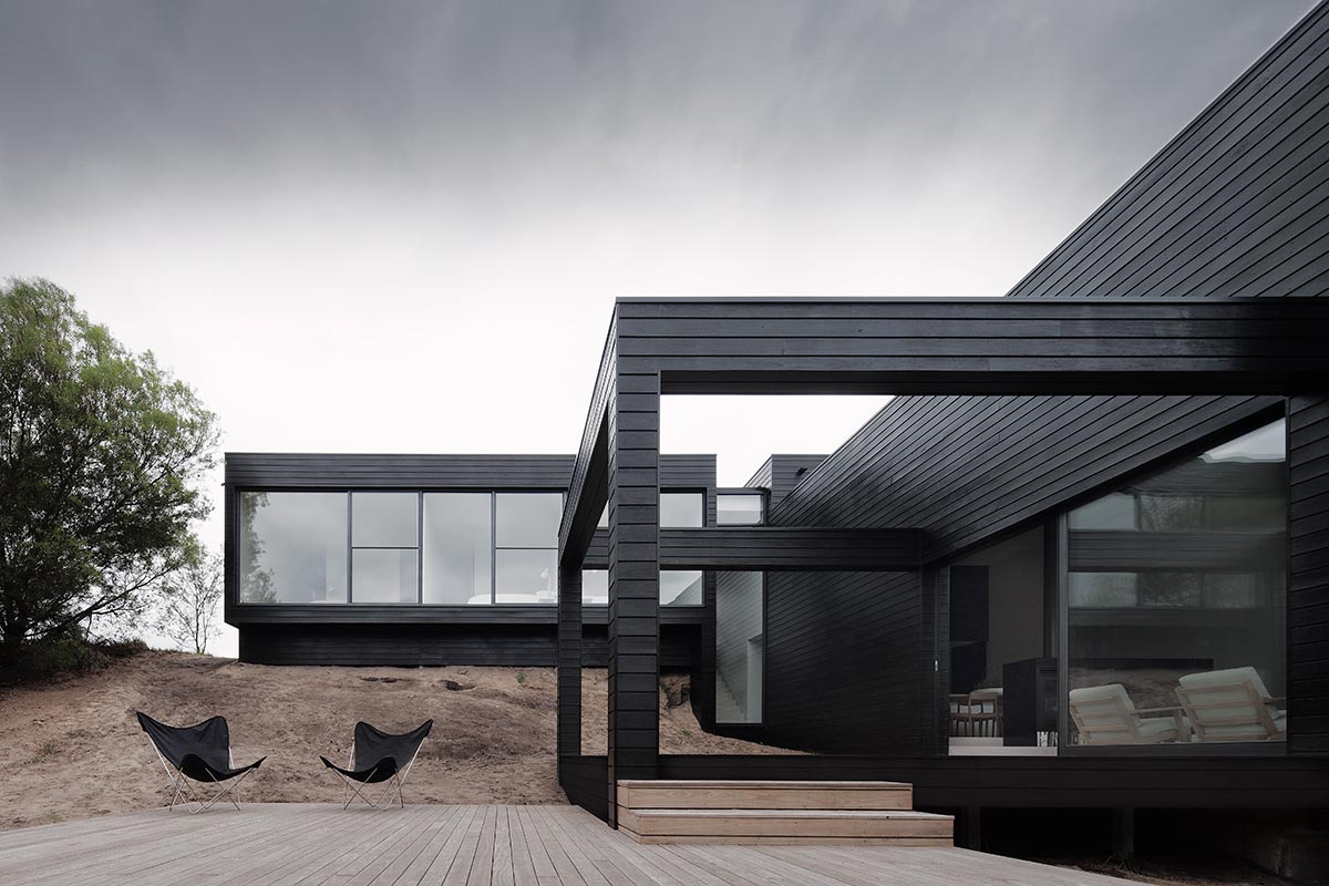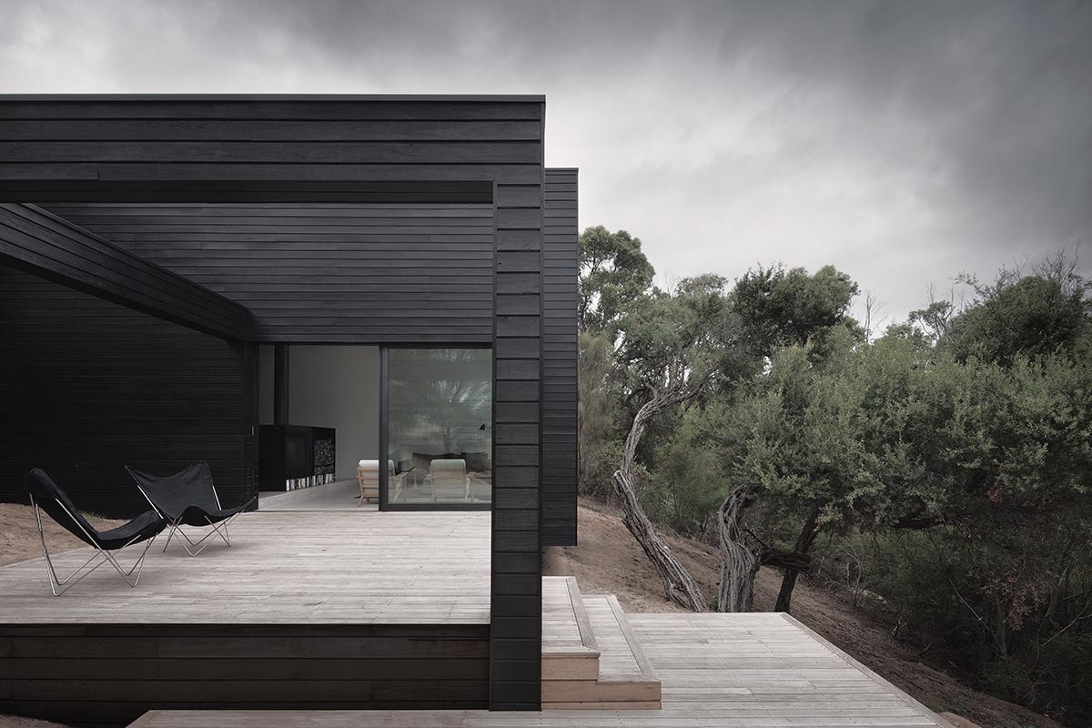 “It is difficult to gain more than a glimpse of the dwelling through the surrounding vegetation. Where the house is visible, it blends within the landscape, the black timber cladding and dark reflective glass selected to help dematerialise the building form from its natural surrounds. The front elevation comprises solely of blackened timber walls, punctured only to signify the entry. From the street the scale of the house is deceptively modest, the second, lower level is non apparent. The building form sits low, within the existing native grasses, promoting opportunities to connect intimately with the landscape.” – Studiofour