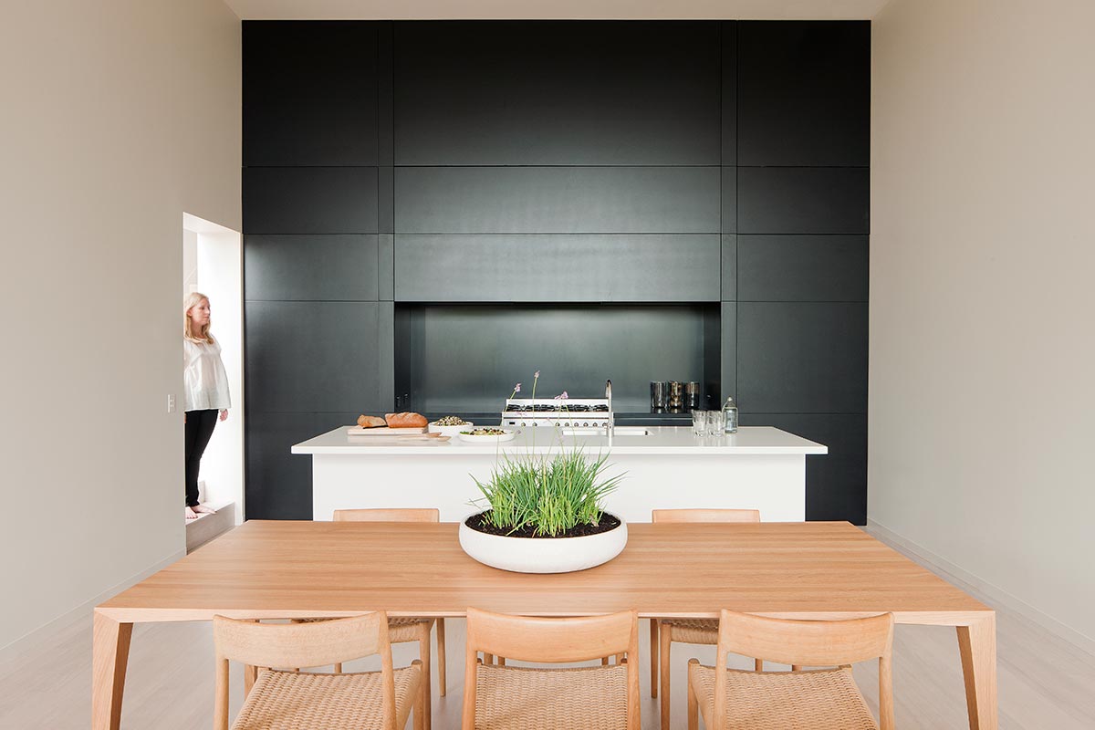 Public and private zones inside the house are clearly defined. The kitchen, dining and living spaces are combined in a single, fluid area, while the powder room, laundry and butler’s pantry are concealed via a panelised black wall to the kitchen.