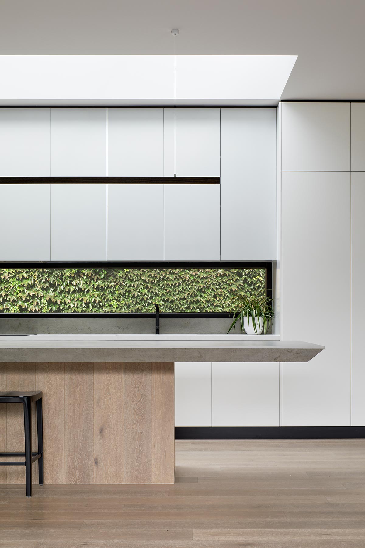 Concrete was used throughout the project for interior and exterior seating, the water feature, and the mitred, cantilevered bench on the kitchen island. It adds subtle variations in colour and texture to the industrial feel of the steel-framed windows.