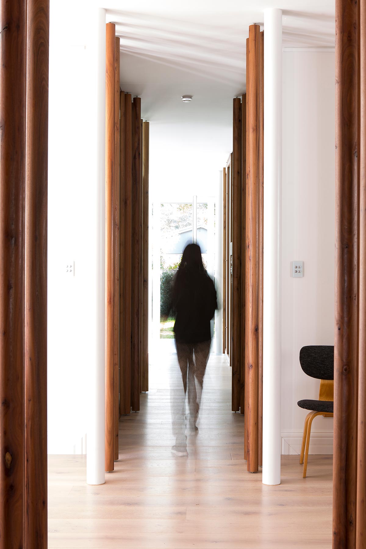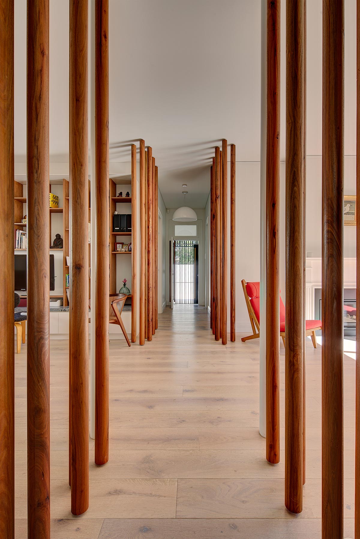 “The tree, beloved by the client, generated the idea for a camouflaging device: clusters of structural columns, steel down pipes and wooden screen posts concealed their function in the guise of slender tree stems that visually extended the garden realm into the house and out to the street. These timber ‘stems’, which unify the new and old portions of the house, have outer casings that spin freely, taking their cue from Buddhist prayer wheels dear to the client’s heart.” – Tonkin Zulaikha Greer