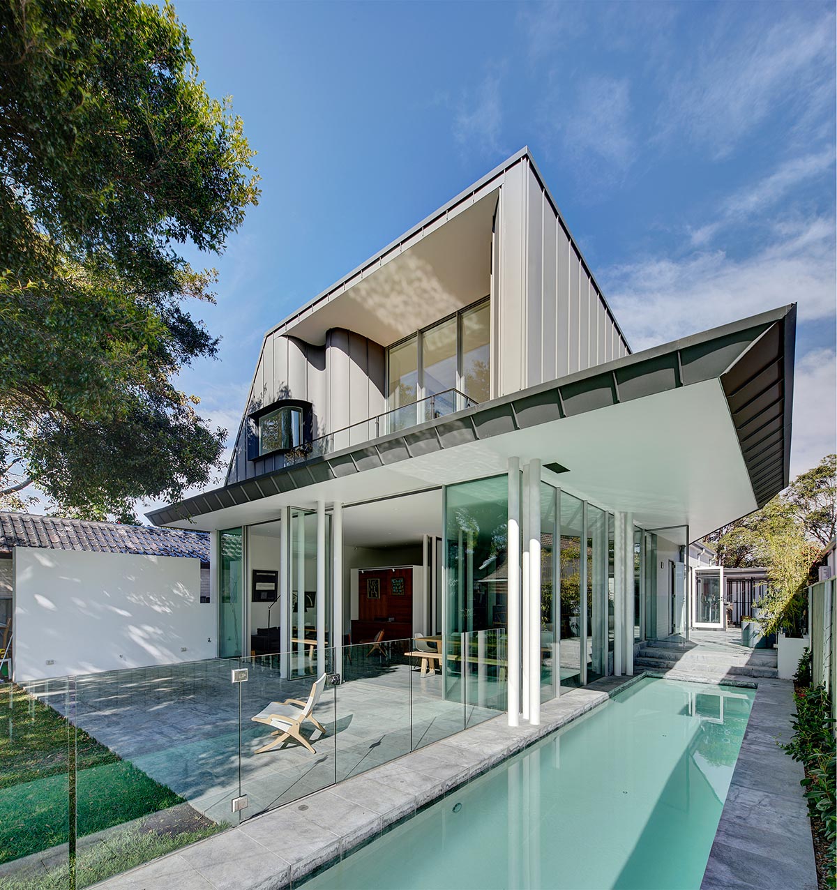 “The ground floor of the house is organised by a spatial cruciform, the central corridor through the cottage crossed by the library and sitting areas. The new corridor is flanked with continuous white glass timber frame doors concealing a range of service spaces, which acts to layer spaces, which then reveal themselves gradually. The new zinc clad ‘hat’ form contains the master bedroom and ensuite, and poetically expresses the permissible volumetric limits for the addition.” – Tonkin Zulaikha Greer