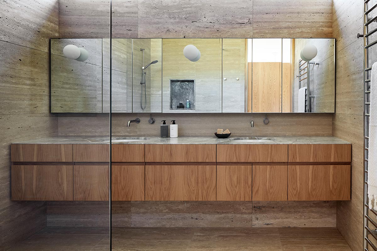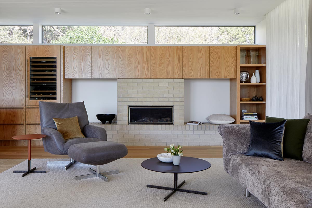 “We gently referenced the modernity of Mies, Neutra, Seidler and Utzon to place this Sorrento project, like its worldly owners, in an international context of design awareness. A Seidleresque ramp leads to a luxurious self-contained upper floor for easier future access, whilst the lower ground floor houses the new laundry and quarters specifically for guests. Underfloor space was reclaimed to create a man cave and occasional storage for a special car.“ – Hindley and Co