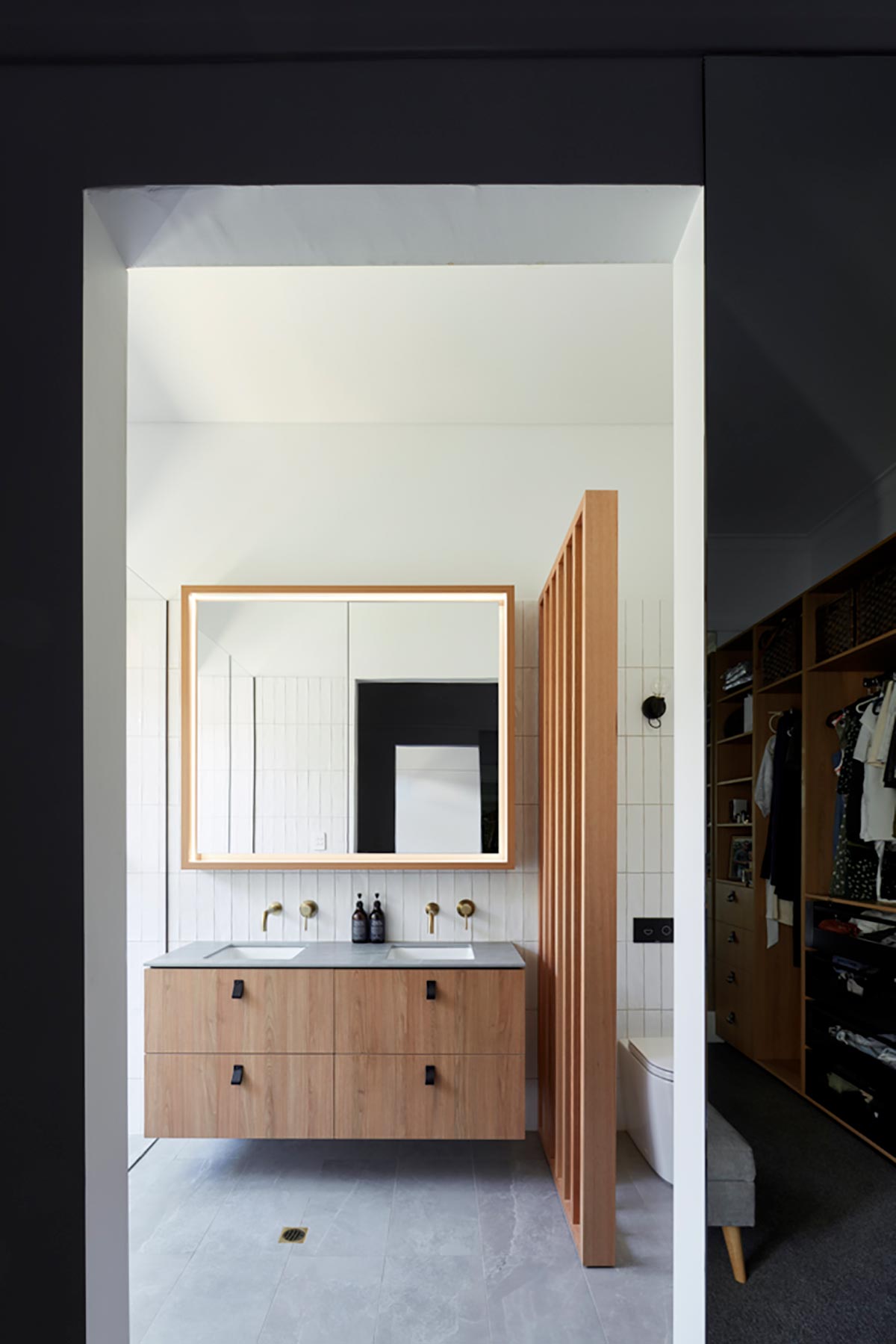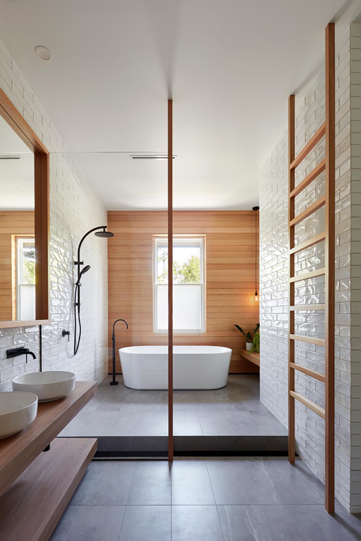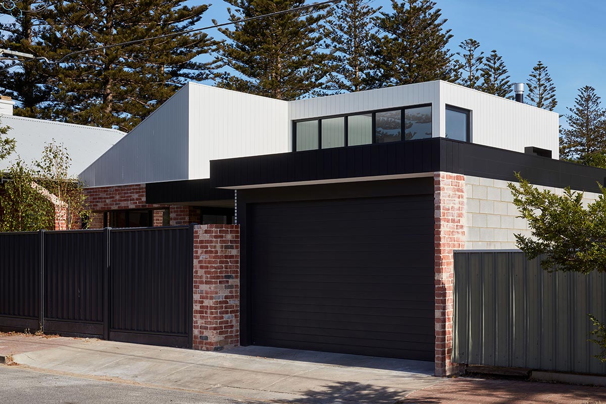 “Externally a combination of recycled brickwork connects the old to new along a low datum, whilst vertical profiled cladding wraps above blurring the building line whilst emphasising the mid suburban coastal location.” – Ply Architecture