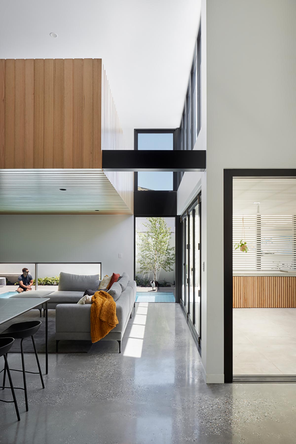 Bringing the energy of the surrounding area into the home, the interior finishes were carefully selected and chosen to suit its location. Floors, walls, and fabrics are kept white and light, allowing daylight to playfully bounce around the living spaces, which adds a more relaxed and fun ambience with a subtle coastal touch. The warmth of the timber furniture and finishes helps to bring warmth to the monochrome aesthetic.