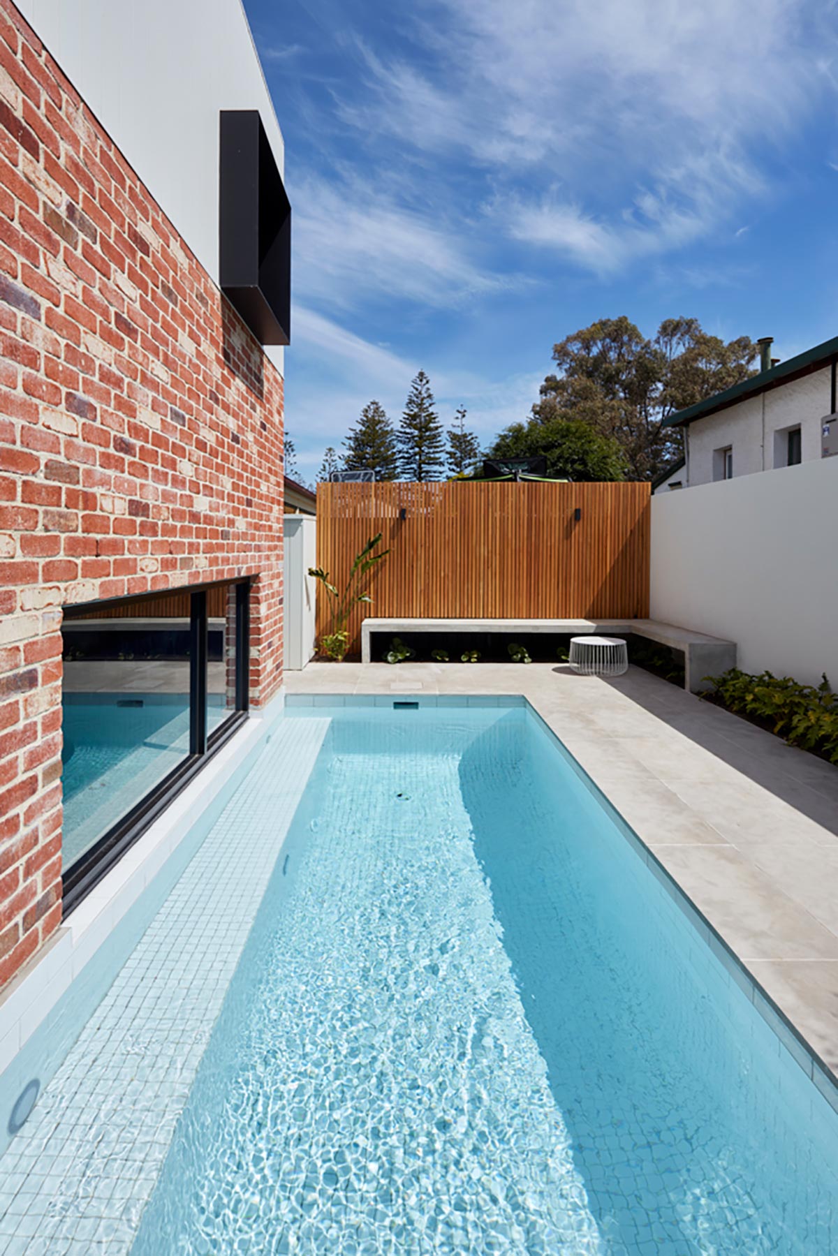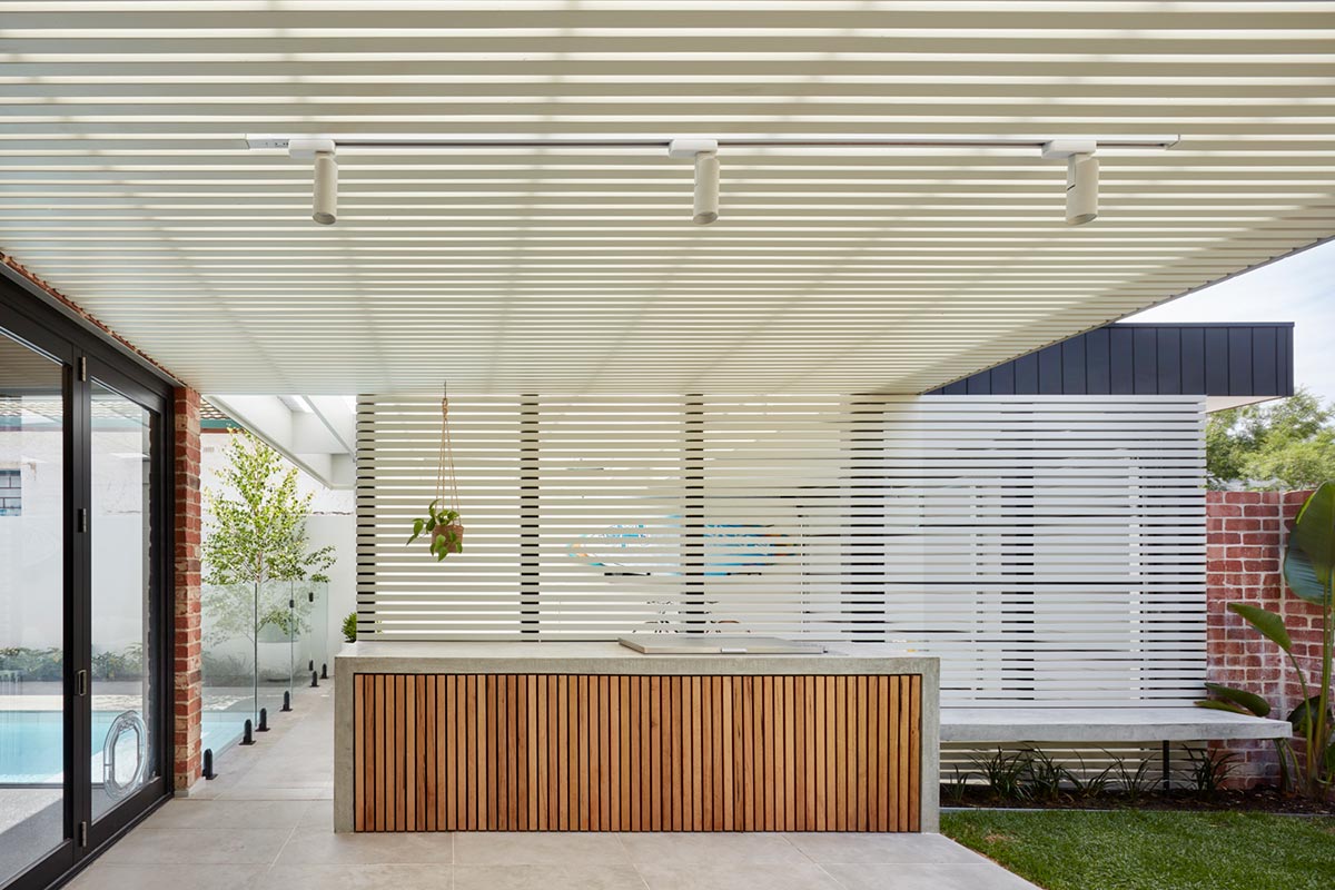 “This addition to the rear of a character single-storey bungalow in Henley Beach shifts out to maximise its northern exposure whilst directing the program and flow to the west. Intentionally the form explores cohesion & reinterpretation of the existing visual language, mimicking the elevation proportions of the existing residence whilst moving in and out creating a plan that responds directly from the internal program to the external spaces.” – Ply Architecture