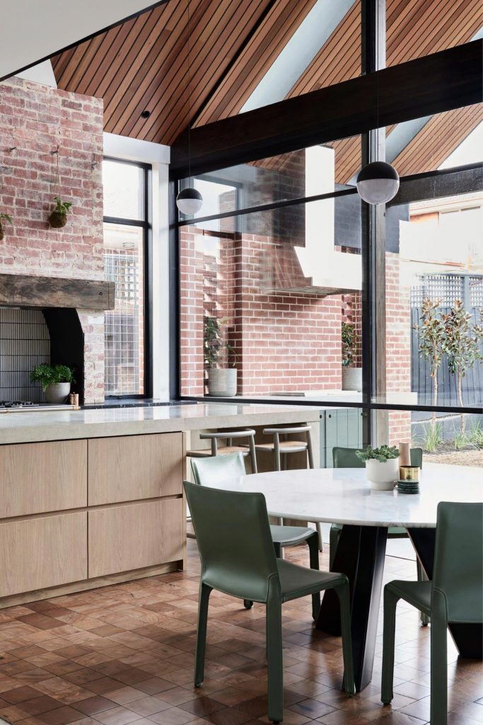 The St Georges Road home in Elsternwick gets a lot of its character through the clever combination of textures. I absolutely love the fusion of modern minimalism with cosy traditional. Colour has not been forgotten and more importantly, it has been used spectacularly!! Deep green and blues are definitely the heroes which link to the moody theme created in the formal living area. But the hero for me has got to be the integration of the exposed red brick throughout, there is just something so hearty and welcoming about the raw texture of brick. Too much can be overwhelming, not enough can look out of balance. Together Bayley Ward and Larritt Evans have created the perfect balance.