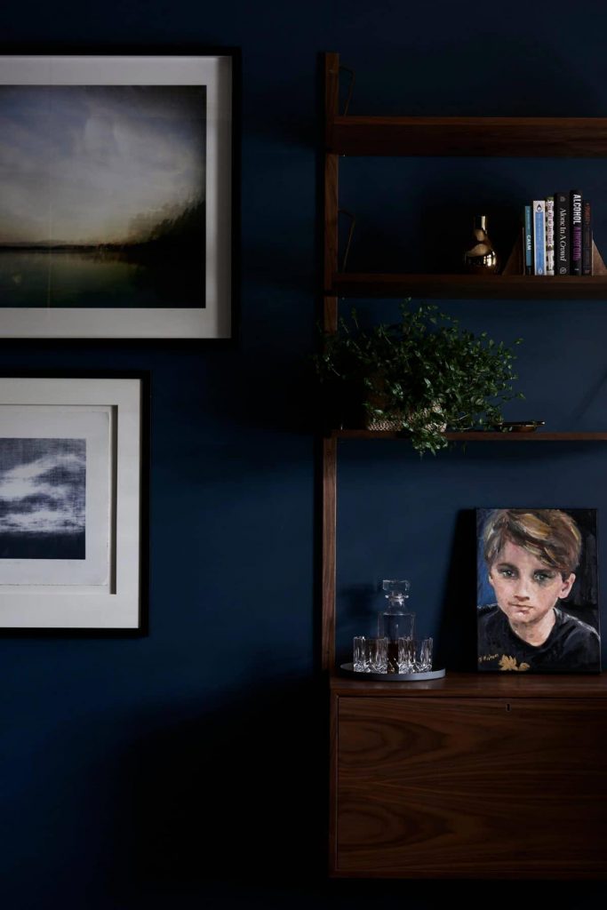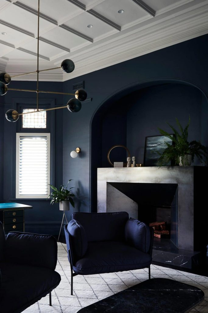 Upon entrance, you are greeted with a decoratively arched pathway, including a stained glass window and black and white checker tiles in the foyer. That I find reminiscent of stepping through a Parisian foyer, oui oui. The intricate stencil work on the timber stair railings have a neo-gothic appeal and are a bold feature alongside the dark parquet flooring. The formal lounge room with fireplace screams indulgence and is layered with deep blue which sings against the Berber Knot Atlas Rug. This moody first look is practically begging me to grab a glass of whiskey and crack open a new deck of cards and you know what, I’d be happy to.