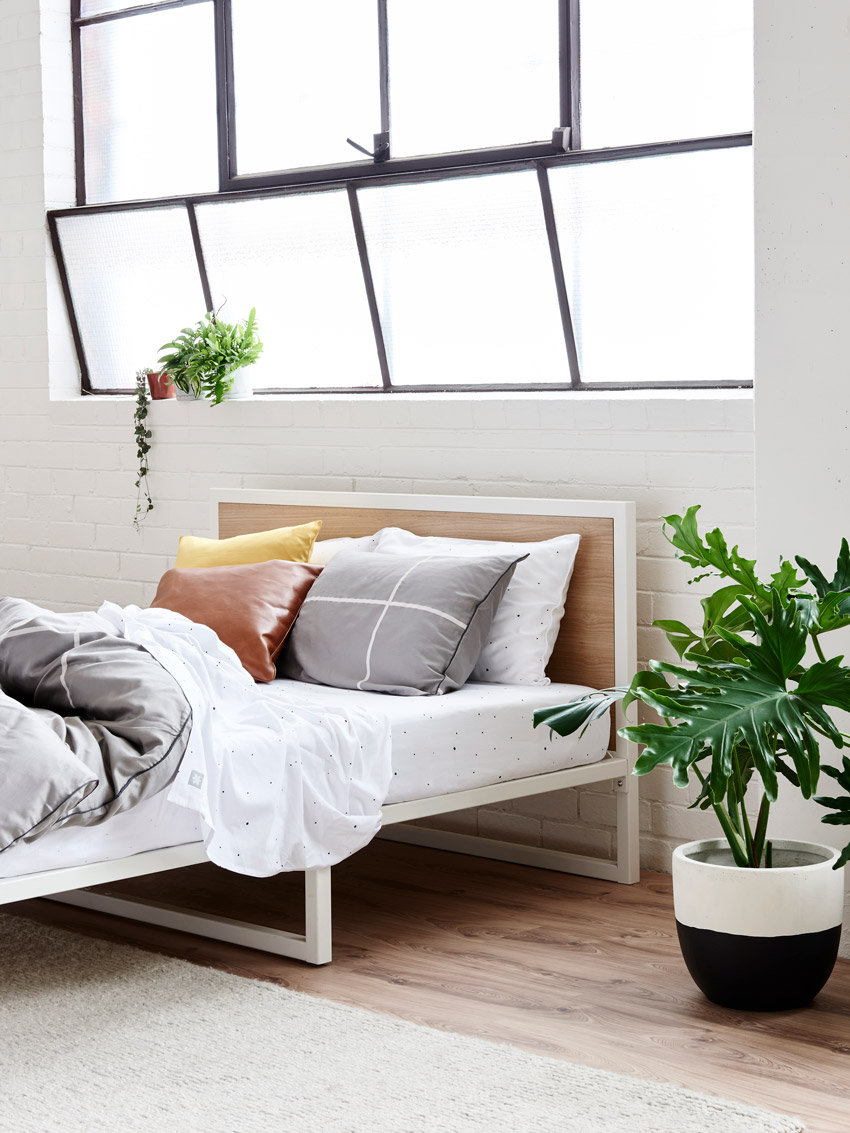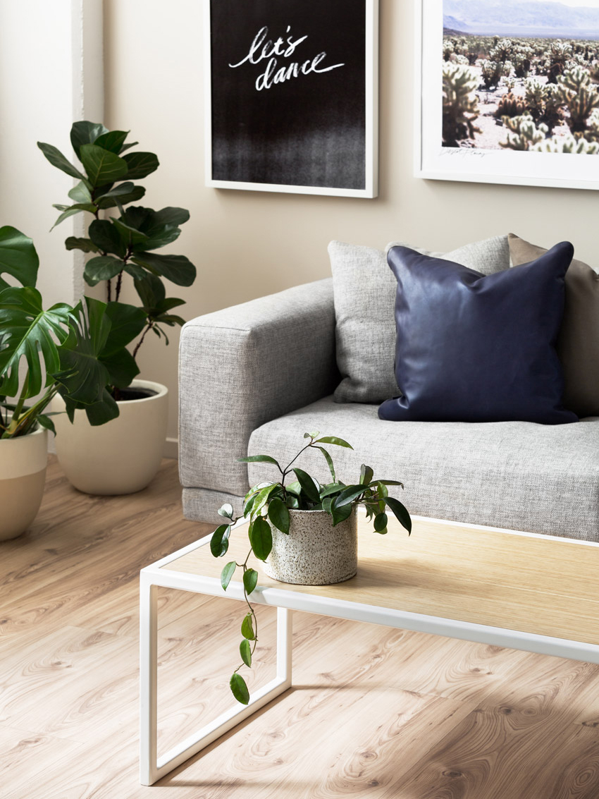 Natural textures like leather, linen, wood, and wool blend seamlessly in a bedroom or lounge room. If you have linen bedding, a leather cushion or wool throw pillow is a great add. If you’re working with a solid colour sofa and want to bring in some personality, adding a textural jute rug to the space can help brighten it up. Adding to the natural look and feel of your space, a few small plants can also help to bring a room to life.