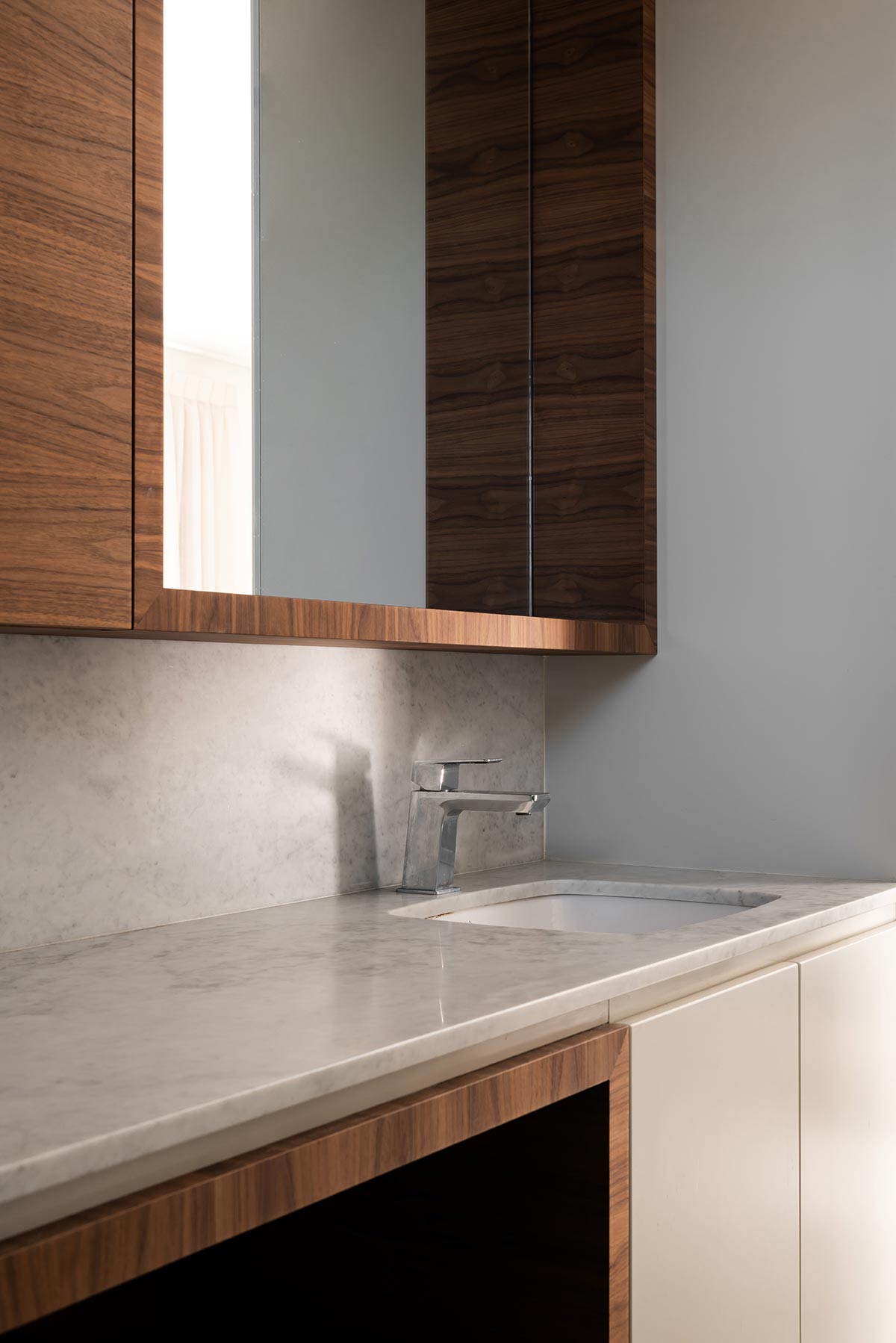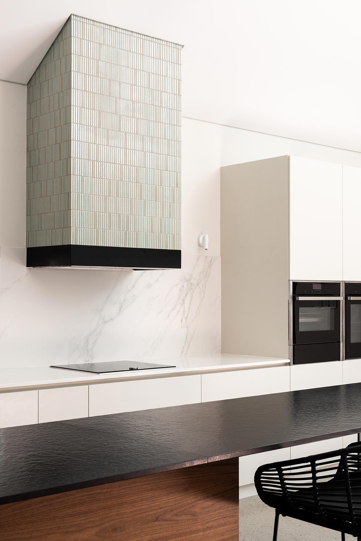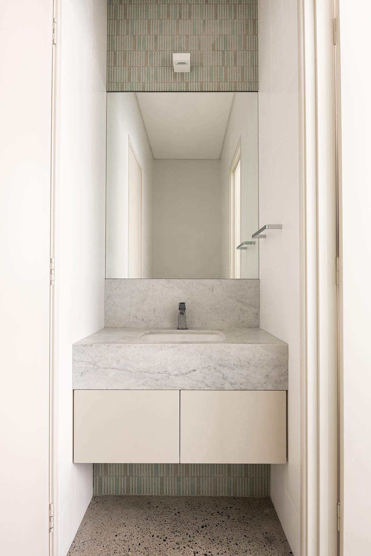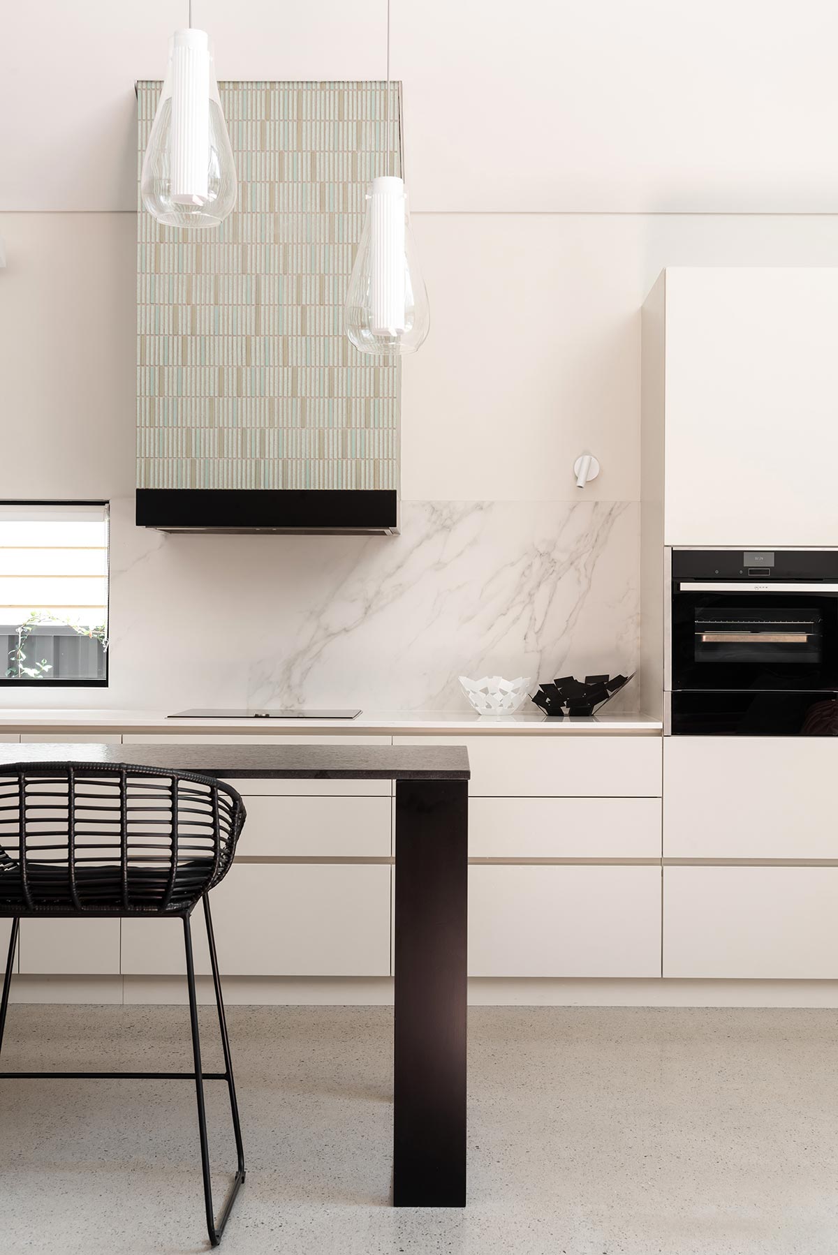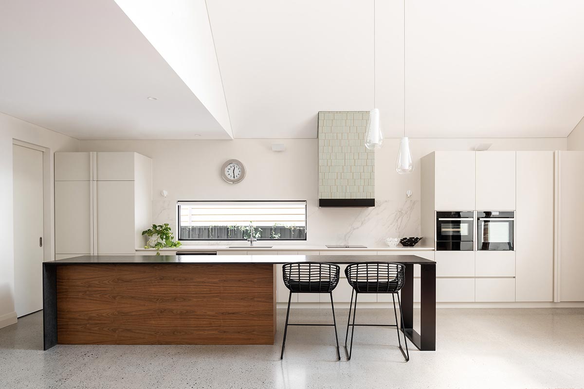The team disapproves using various materials in the project as they find fewer materials calming and more practical, which also means they can order larger amounts of material thus being more cost-effective. Internally, a beautiful ensemble of simple but refined choice of materials was utilised. From the ‘salt and pepper’ polished concrete floor that spans throughout the home, the Carrera marble in the bathroom benchtops, ‘kabuki’ granite benchtops in the kitchen and laundry, and black walnut veneer cabinetry, the whole aesthetic of the home turned out to be very calm and subtle with a perfect amount of warmth.
