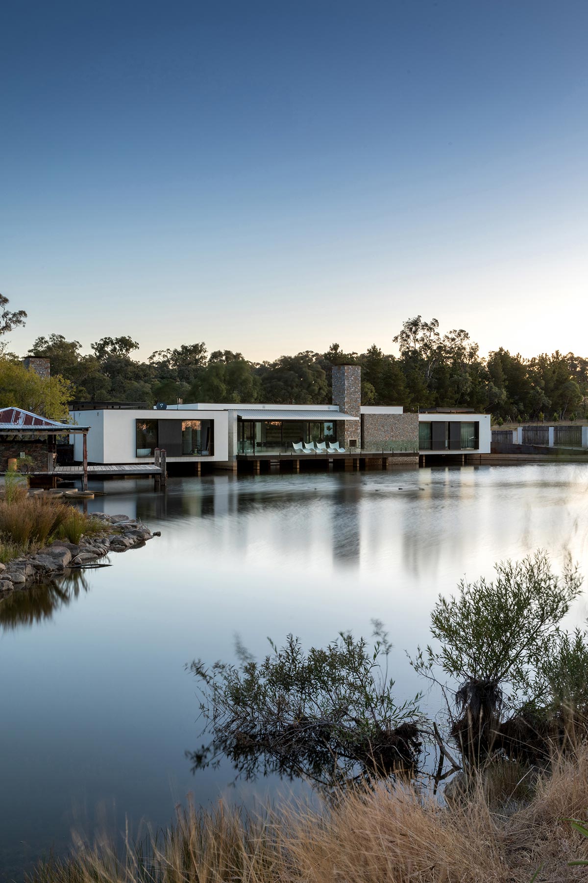 “The property is on Swan Drive, an aptly named street as bird-life is plentiful in the area: black swans, ducks, swallows all in permanent residence. By chance on the first site visit in 2012, the retention dam on the property was flooded after recent heavy rain. This larger body of water roughly divided the site, and became an integral part of the design concept – sparking an idea that would lead to a truly modern piece of architecture.” – Collins Pennington Architects