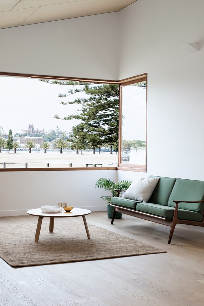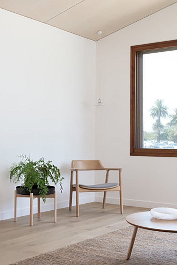The chose of materials was paramount given its close proximity to rough coastal weather and all materials were selected for their robust and resilient nature. The skillion forms are clad in a radially-sawn Silvertop Ash, which will grey over time. This resource-conscious product uses felled timber as efficiently as possible, minimising wastage and celebrating the timber’s rough grain.