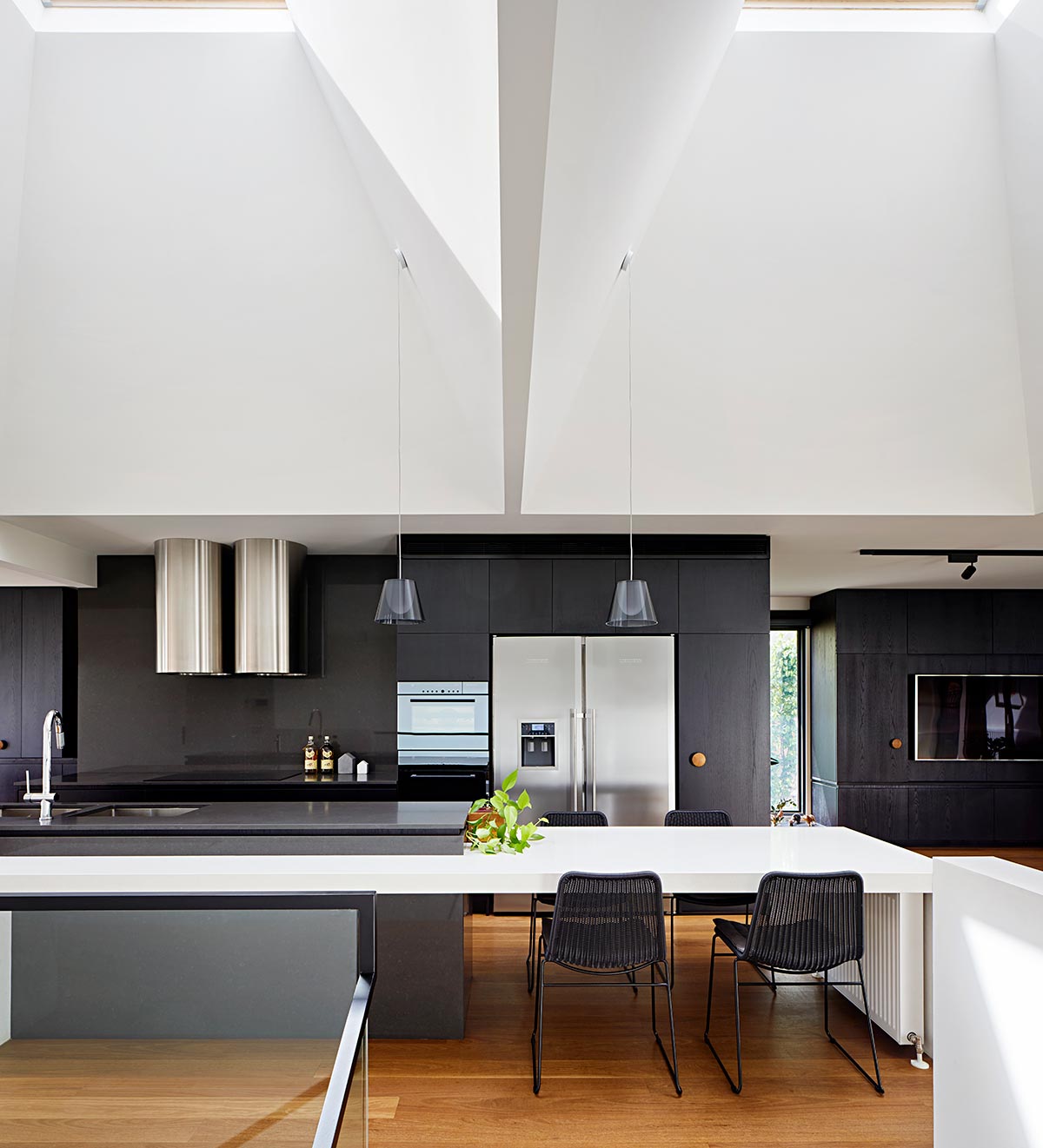 The hero of the home is the feature skylights over the living area and stair void that permit penetration of the morning sun while blocking the harsh afternoon sunlight. The 3 skylights draw natural light into the deepest part of the floor plate to provide a visual focus to the space.