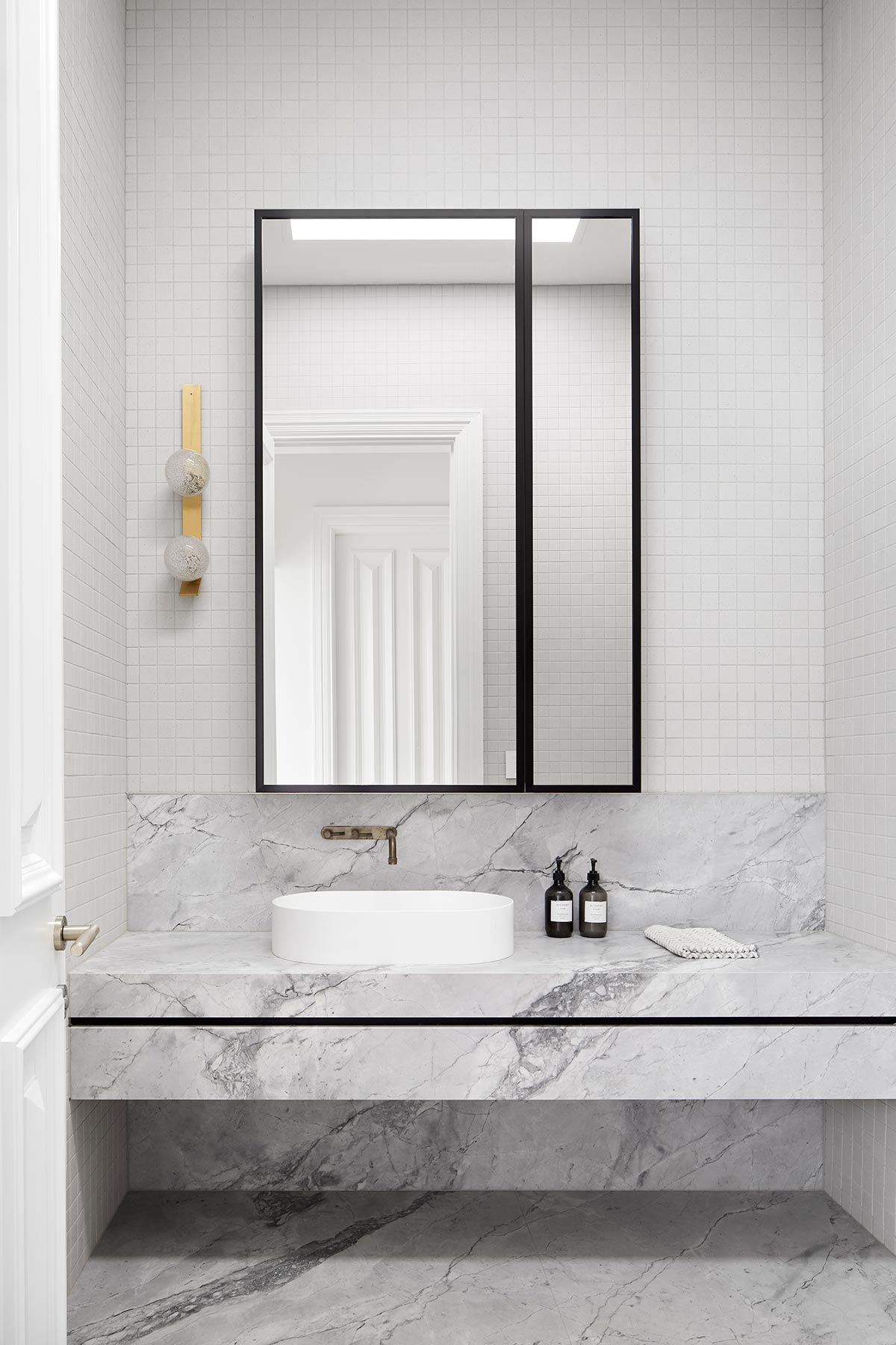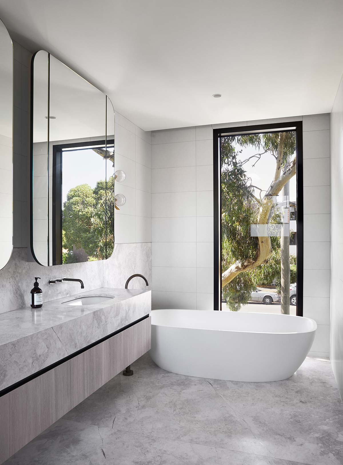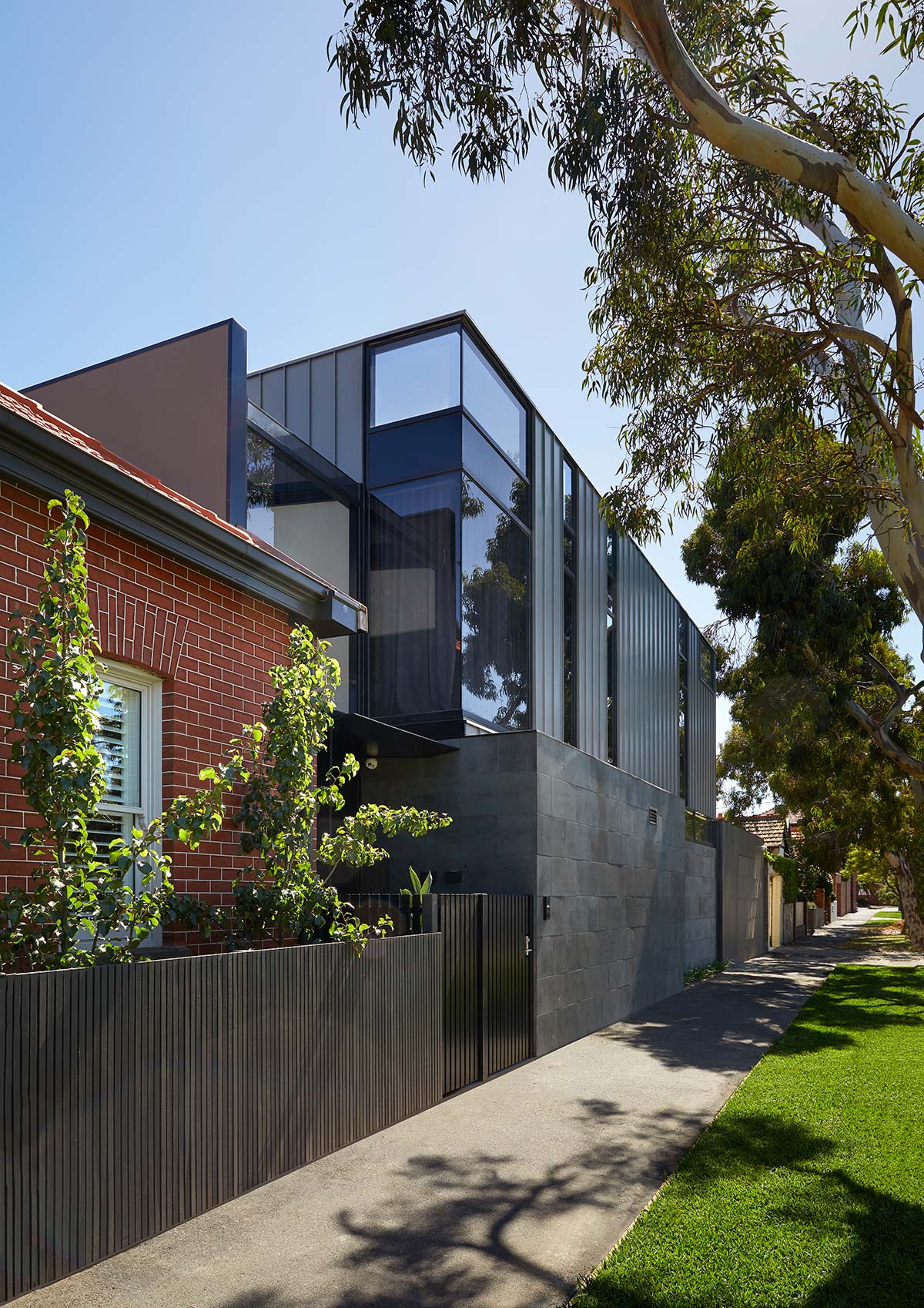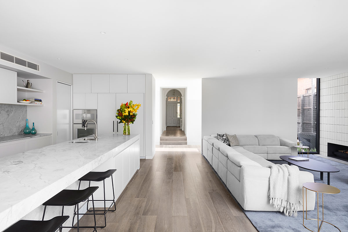 “A visual balance and harmony of the differing architectural styles on the two-street elevation and ensuring the new addition didn’t overwhelm the existing street frontage by controlling height and form aiding in contextualizing the home. With a large amount of glazing, light can penetrate deep into the ground plan into the living and kitchen area and adding glimpses of the sky as you move through the home.” – Finnis Architects