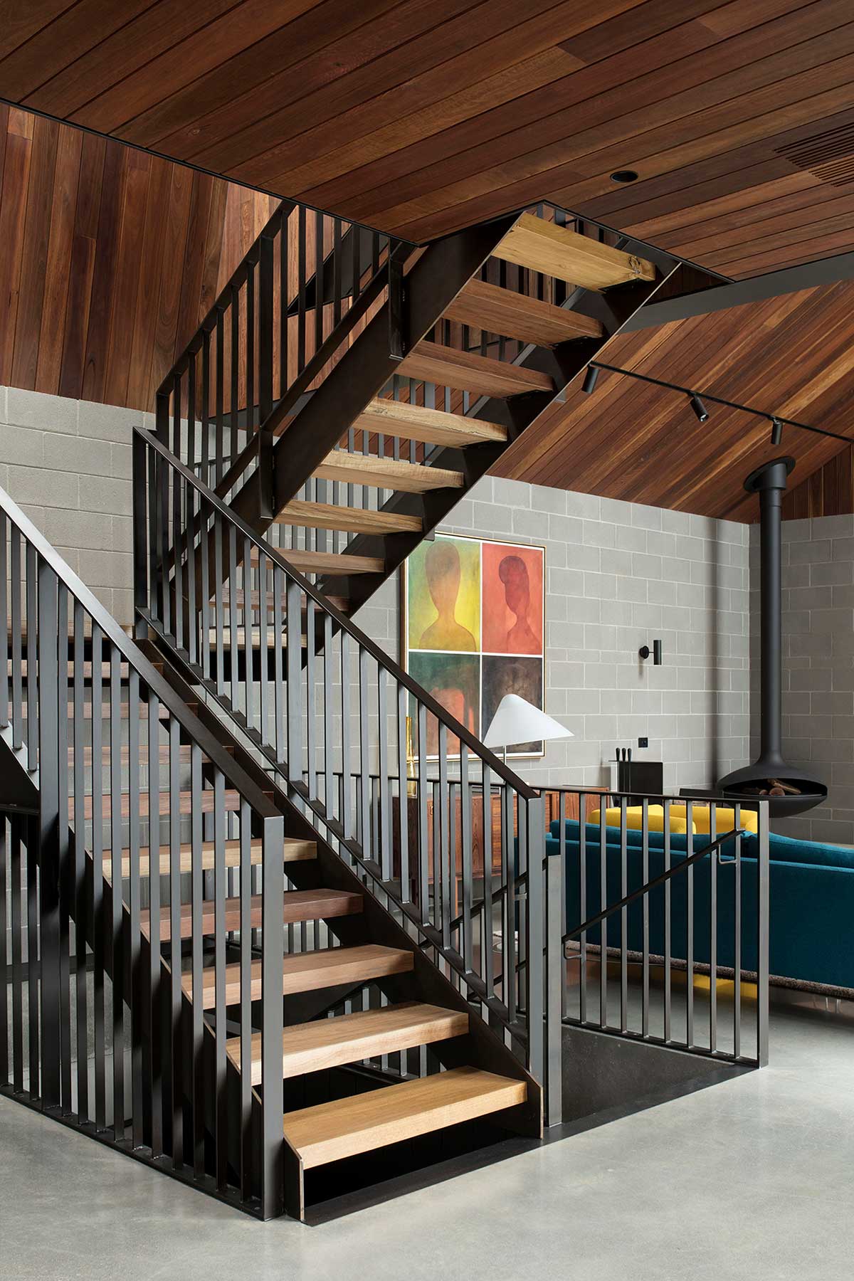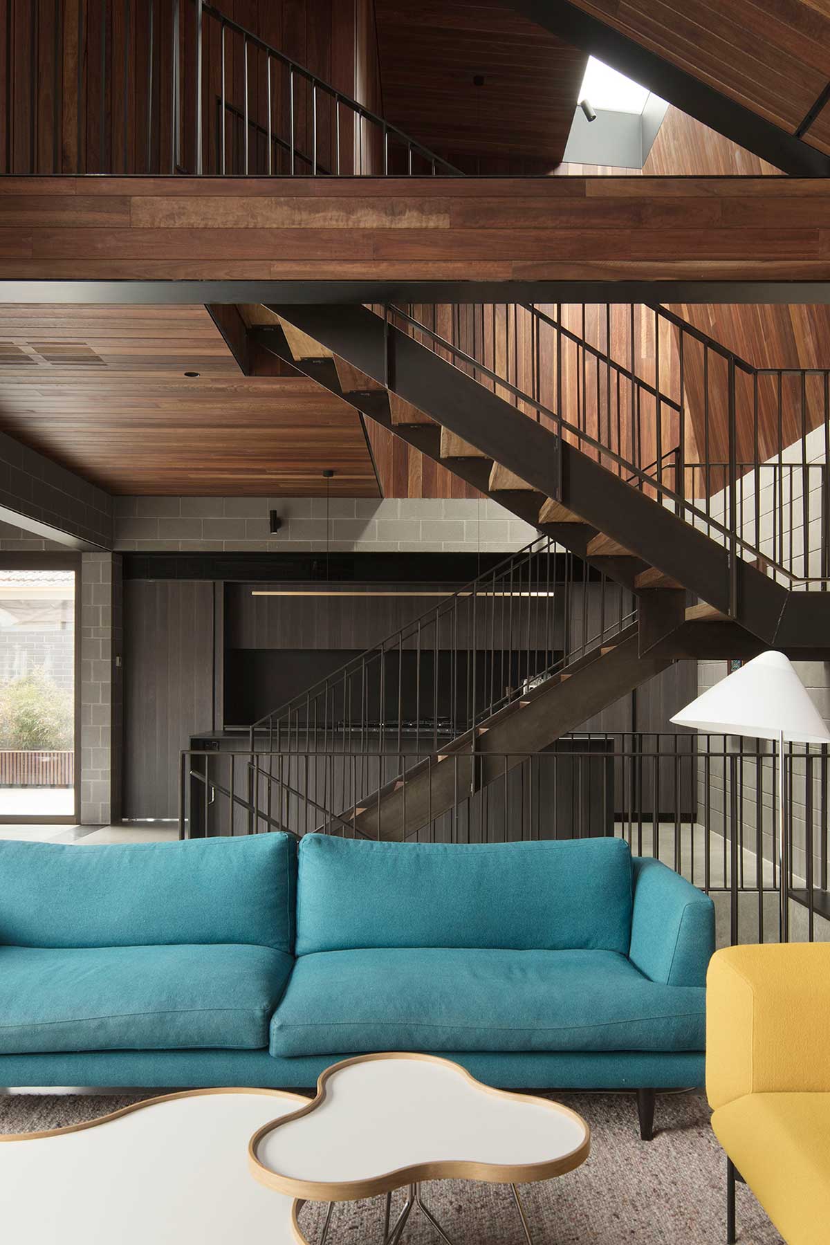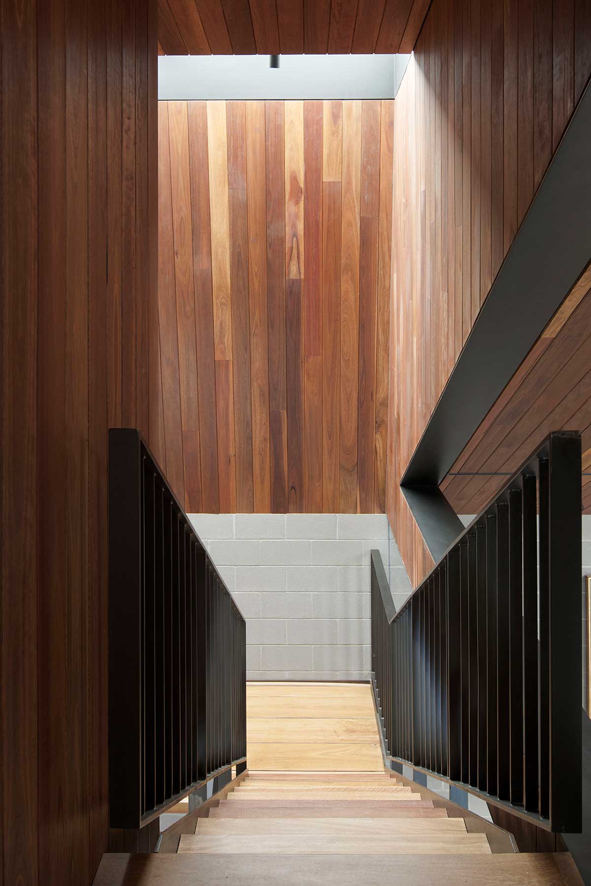 “The steel stair punctuates the centre of these spaces to formally separate the living and the kitchen, the steel blades of the balustrade acts as both fall protection and a spatial screening device. Like the others, the living is distinguished by a change in volume, the raked ceiling allows the room to feel generous, while at the same time bringing in additional northern light into the room. It was also important for us that all rooms shared commonalities and felt unified, so our use of block wall and timber cladding was key to holding them together.” – MODO Architecture